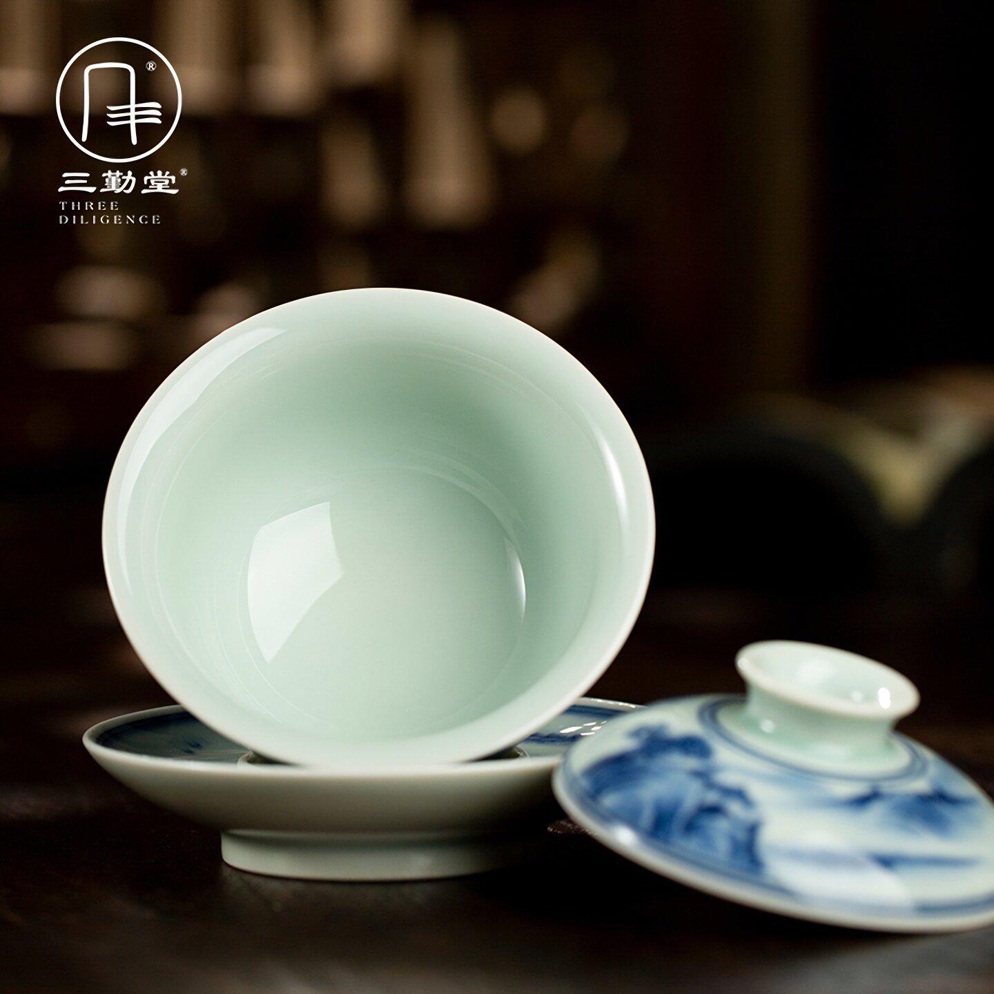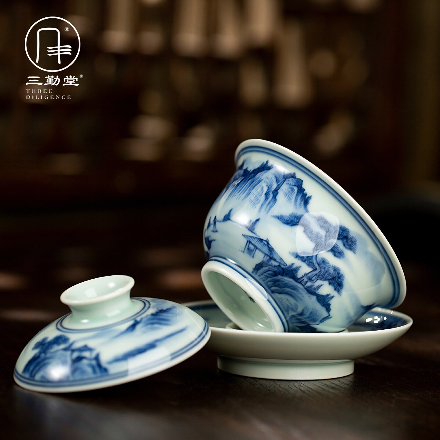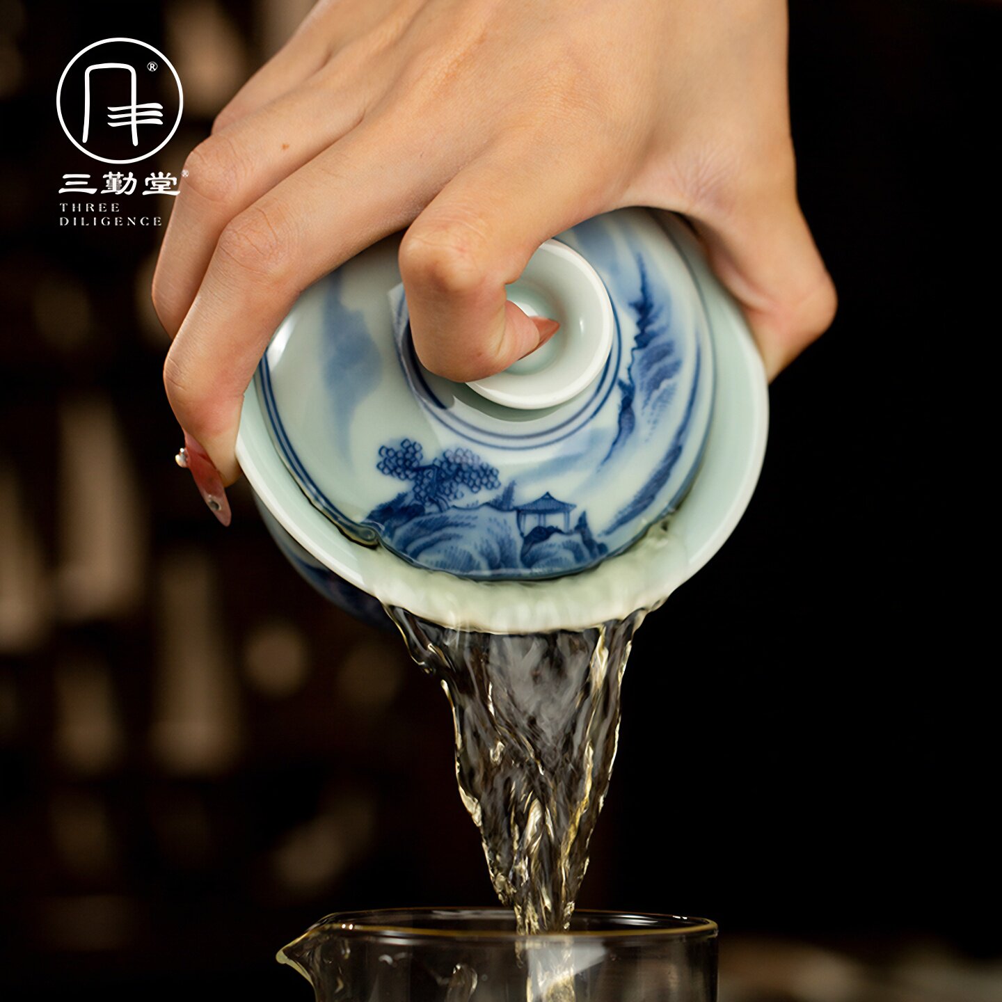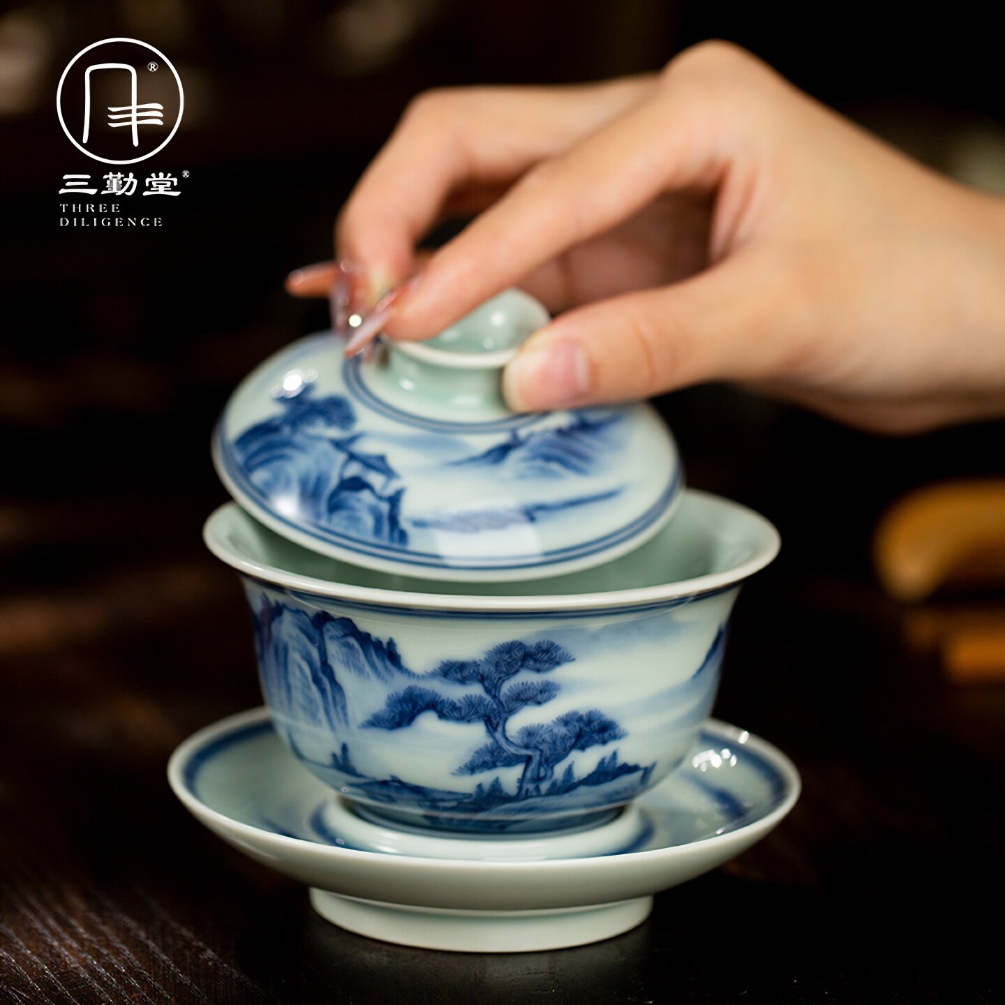 📚 三勤堂景德镇陶瓷手绘青花瓷泡茶器山水三才盖碗不烫手茶杯单个