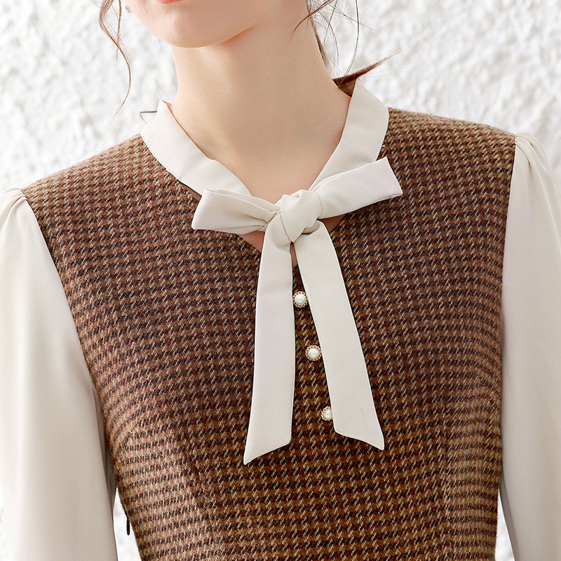 卡其拼接连衣裙格子年会