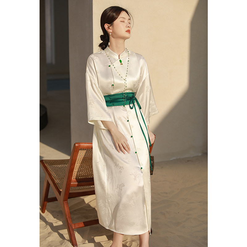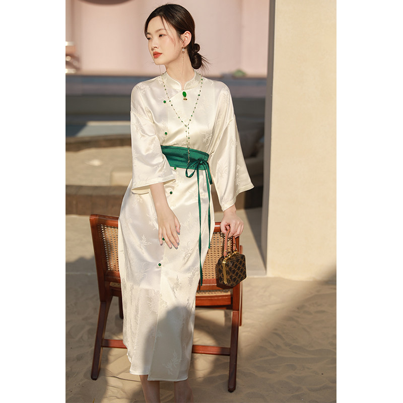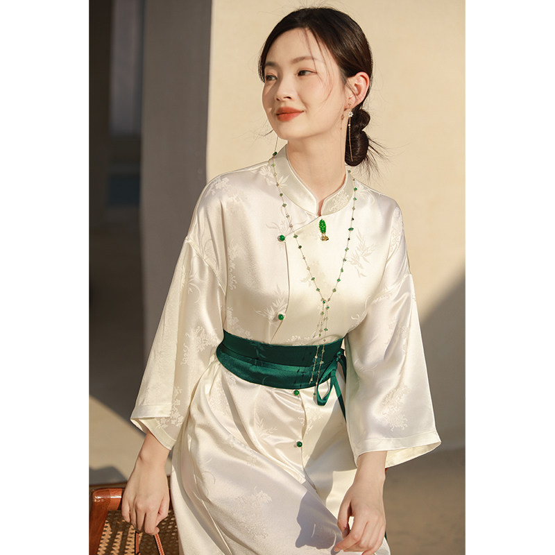 📚 SHIBAI拾白新中式春秋禅意国风醋酸梅兰竹菊连衣裙白色大气中长裙