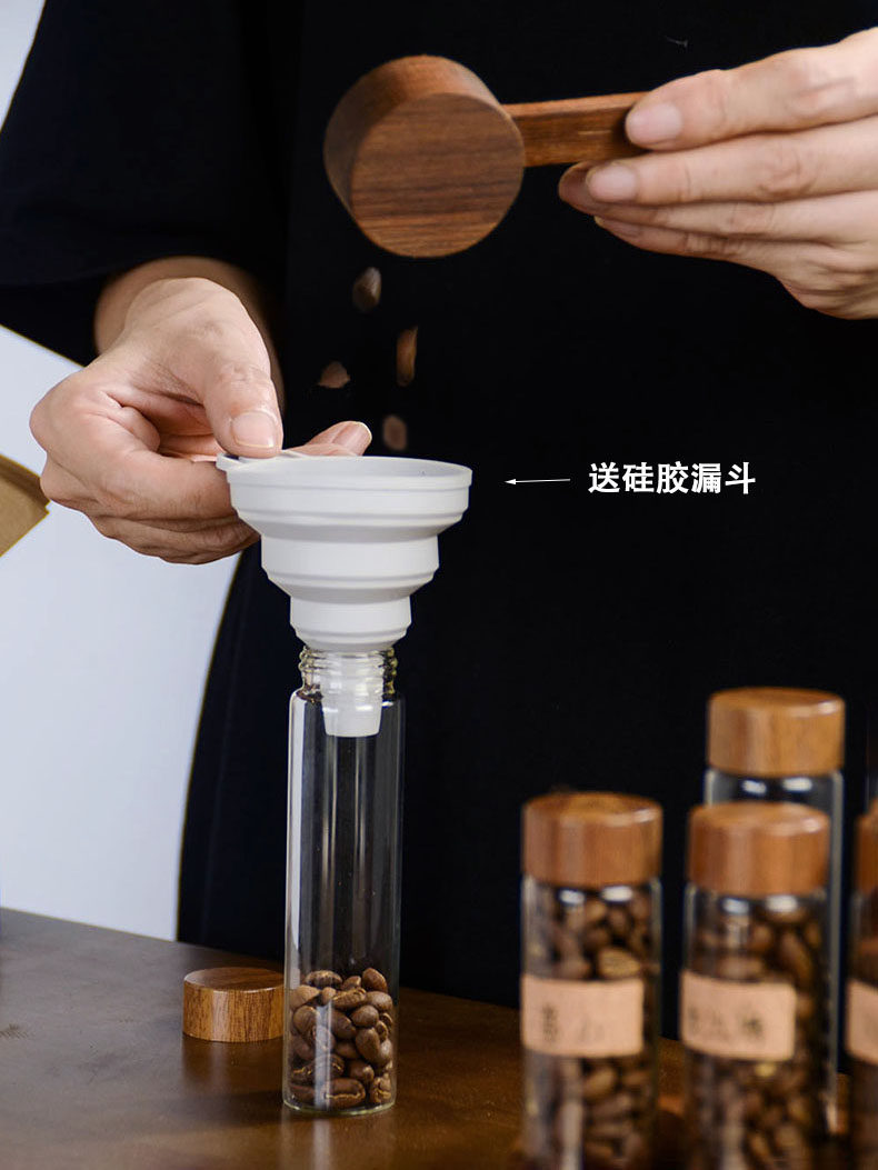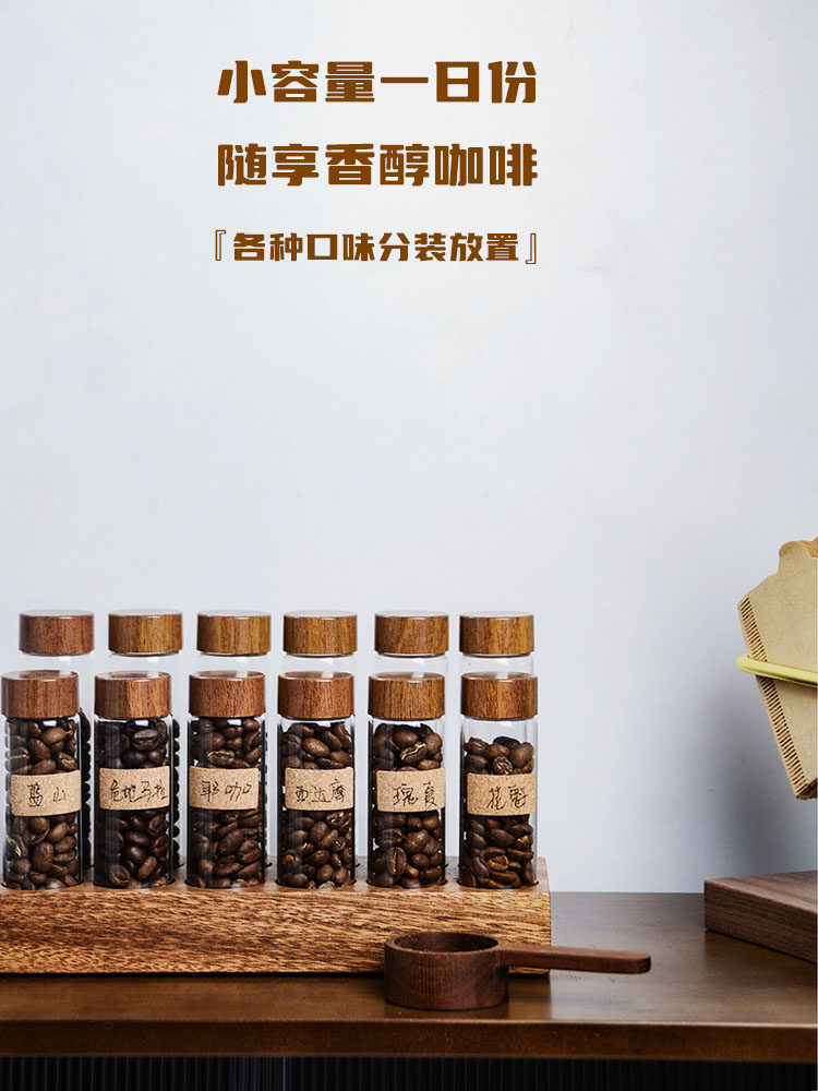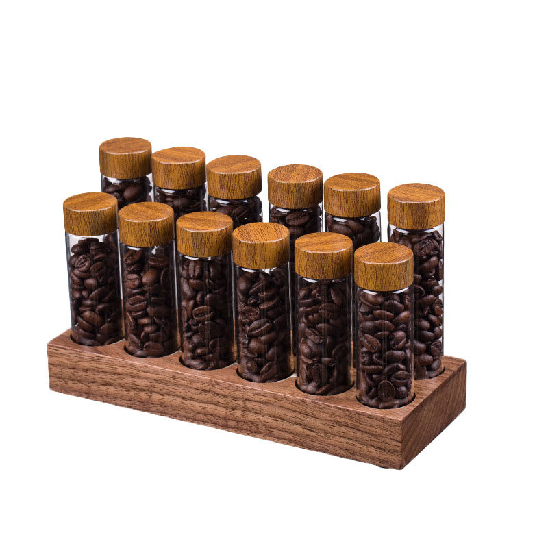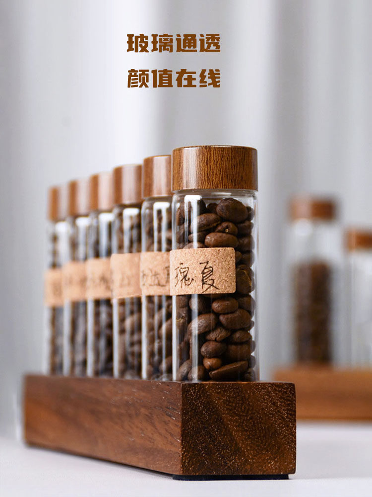 📚 咖啡豆储存罐试管玻璃分装瓶胡桃木展示架咖啡粉闻香瓶迷你密封罐