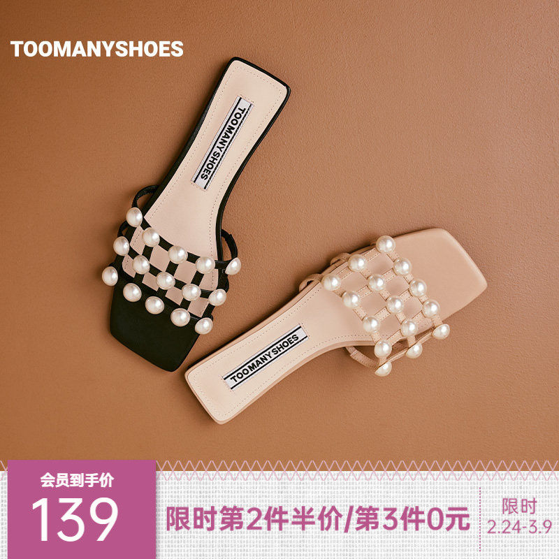📚 Toomanyshoes女鞋夏季新款珍珠雨点一字拖方头平底凉拖鞋外穿