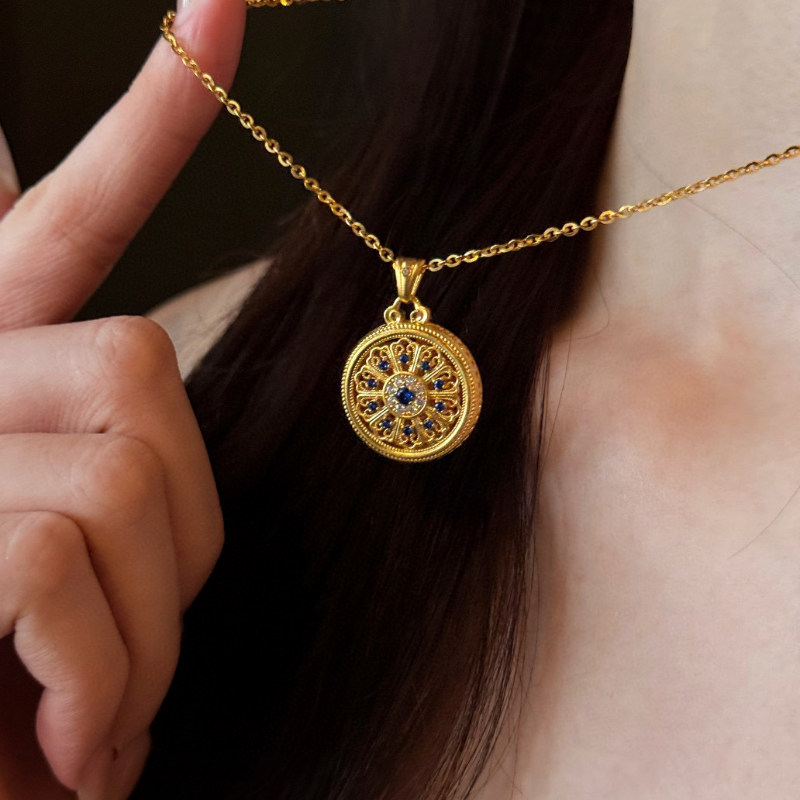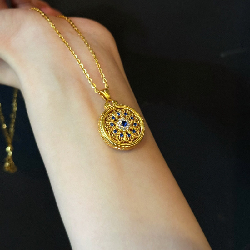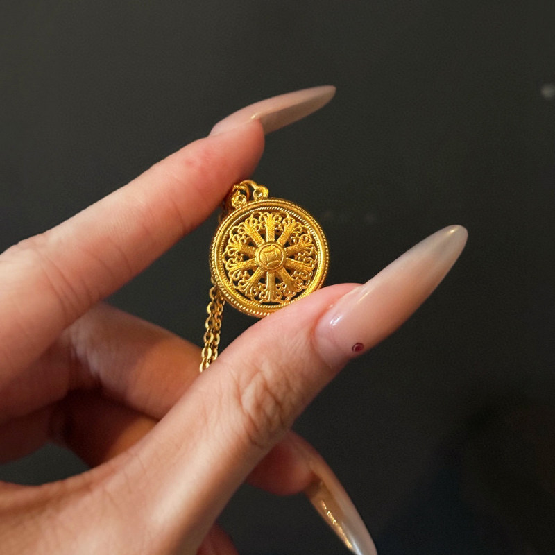 📚 5D硬金黄金宝相花罗盘吊坠女999足金点钻镶嵌纯金项链挂坠送女友