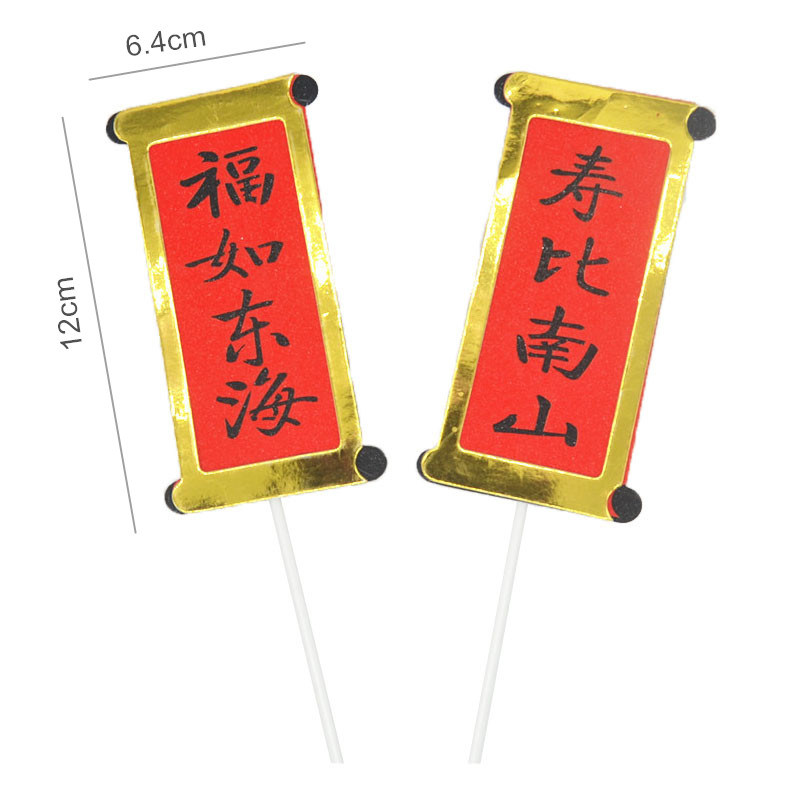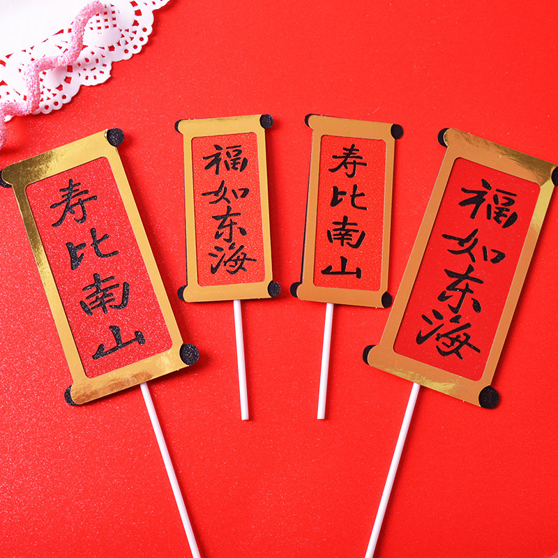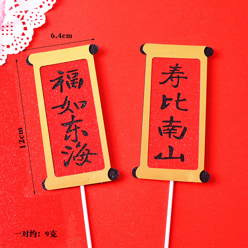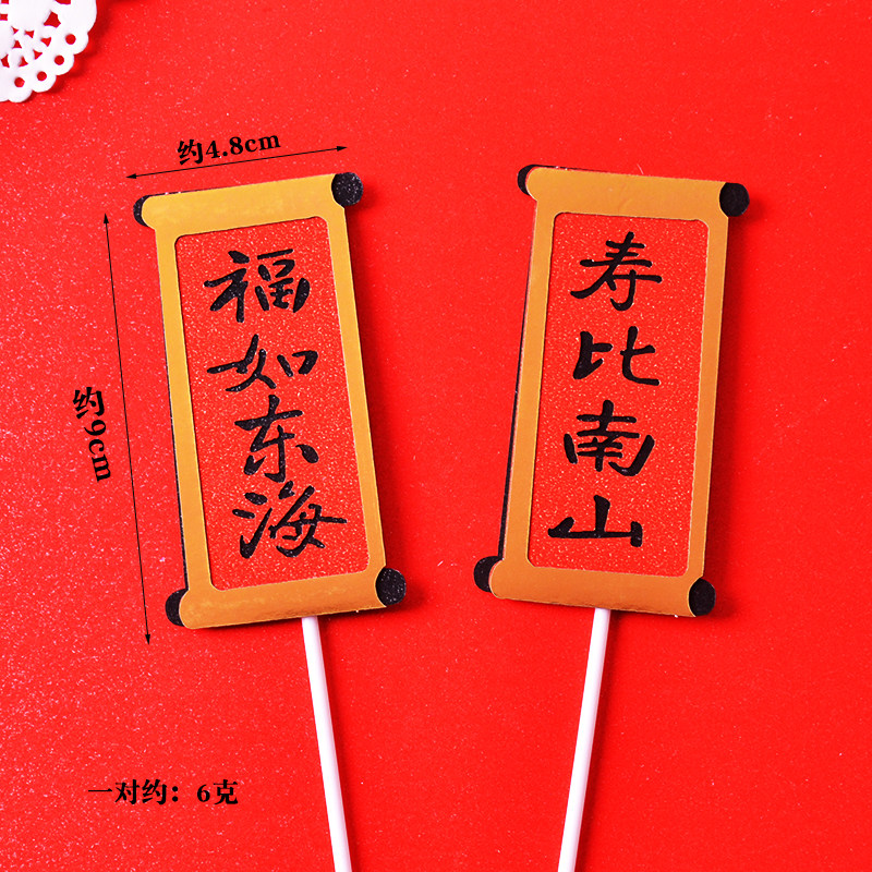 📚 福如东海寿比南山对联烘焙插件红色折扇老人祝寿生日蛋糕装饰插牌