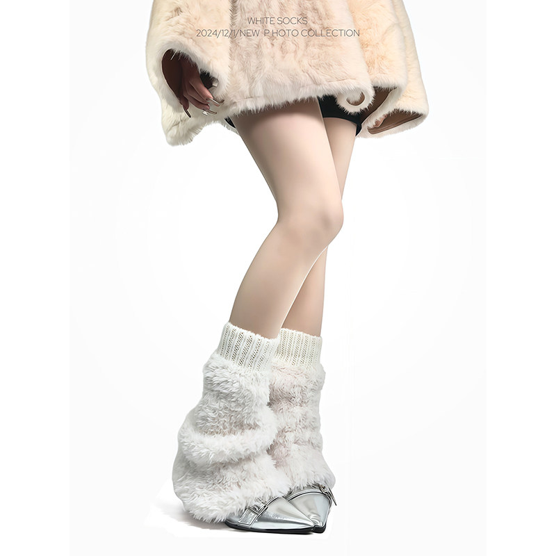 📚 white socks米白针织拼接毛绒袜套y2k喇叭筒加厚雪地靴堆堆袜套女