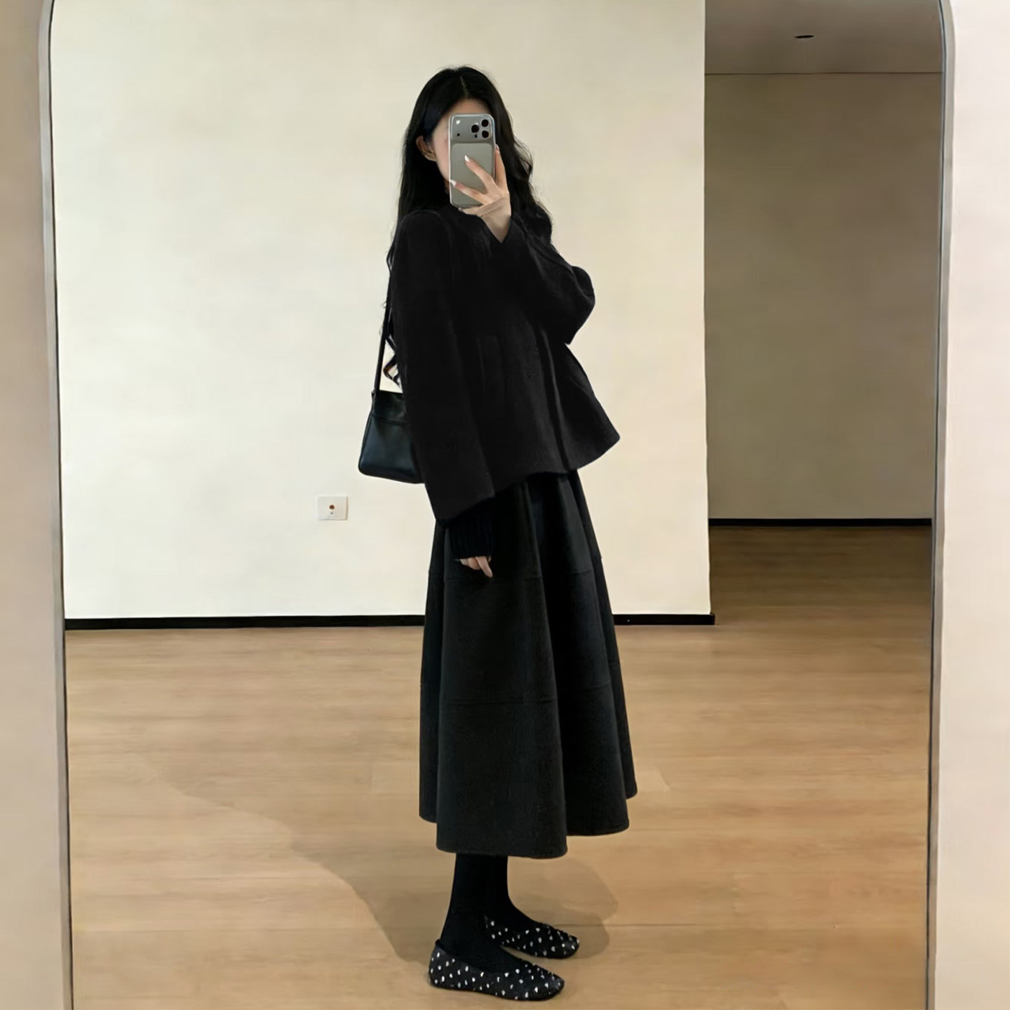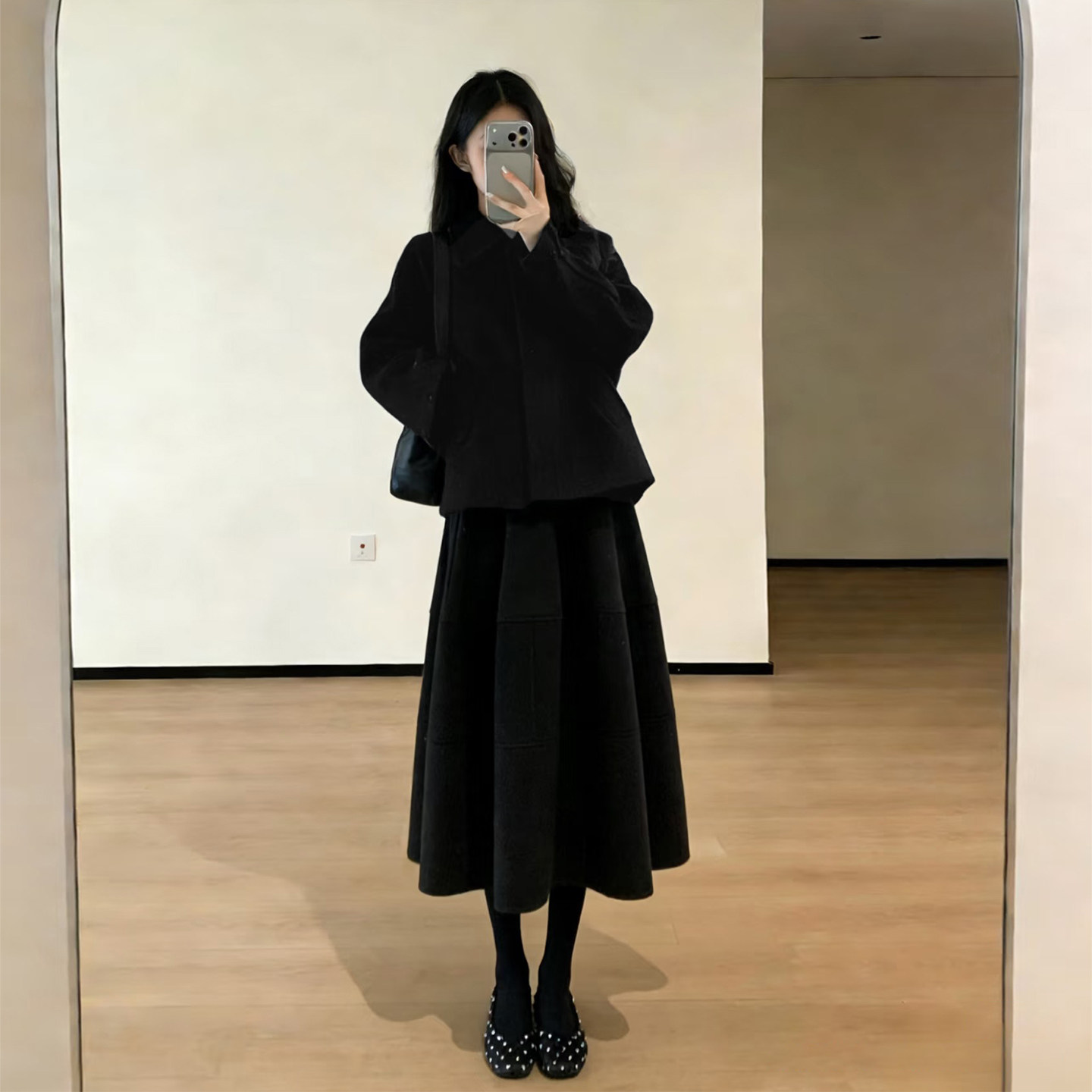 📚 极简风黑色毛呢套装女秋冬季高级感小个子翻领外套半身裙两件套