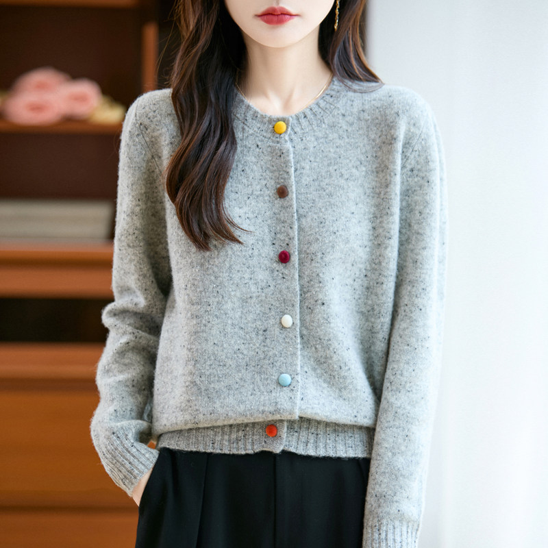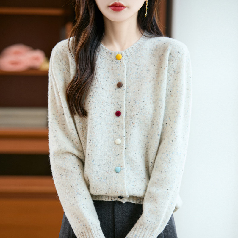 📚 100%纯羊毛开衫女圆领彩扣毛衣外套点子花纱针织打底加厚外搭叠穿