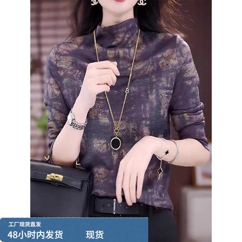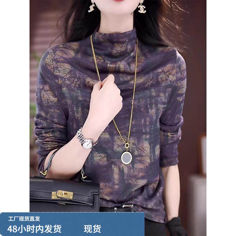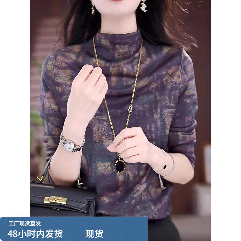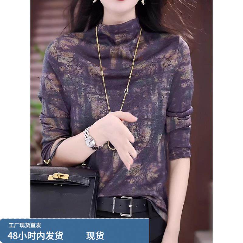 📚 紫色半高领长袖加绒T恤女秋冬季欧货加厚印花晕染打底衫内搭上衣
