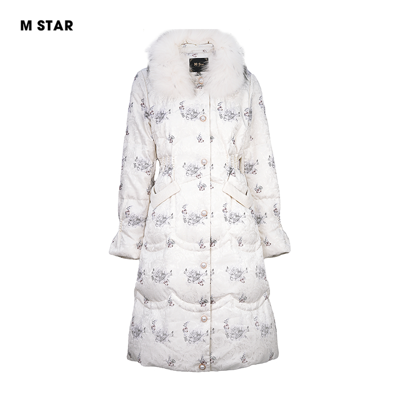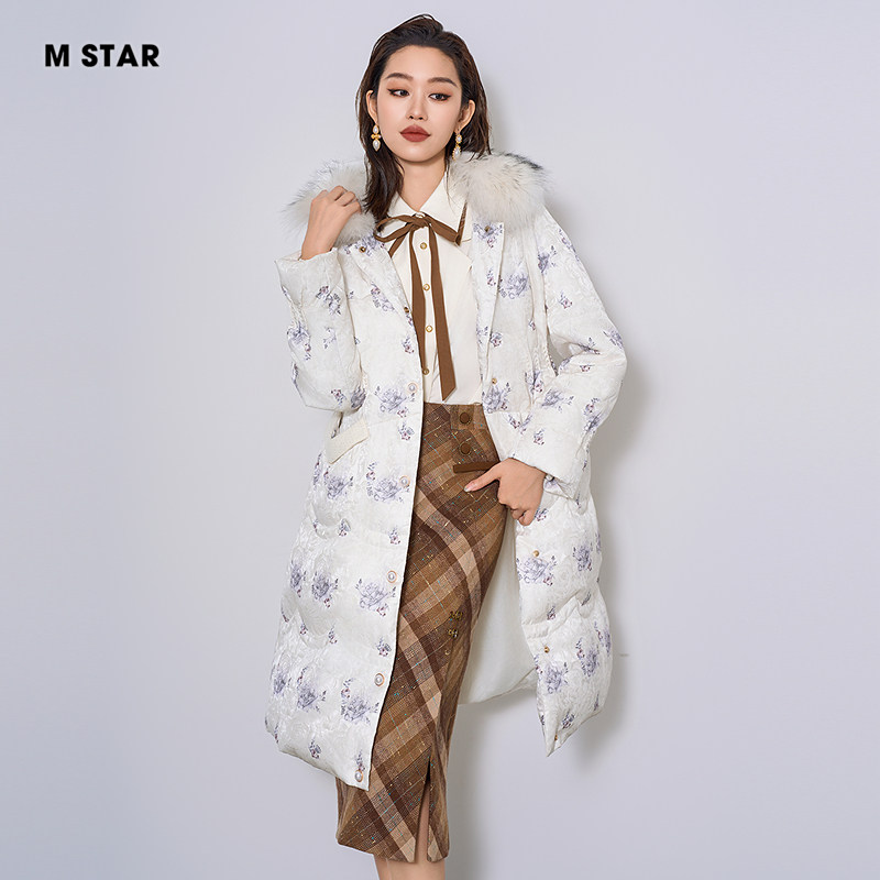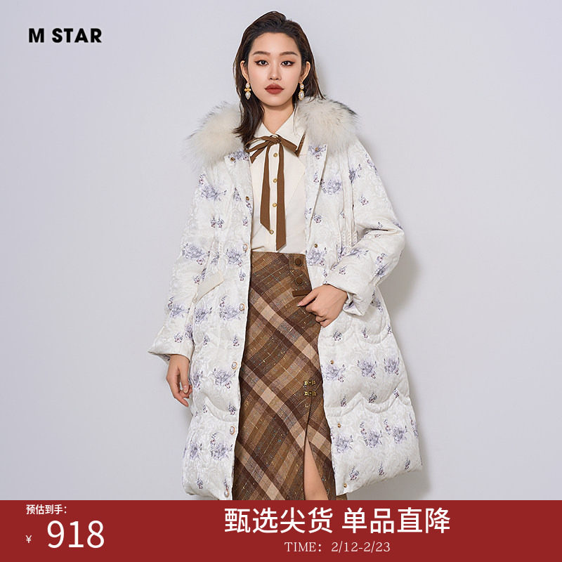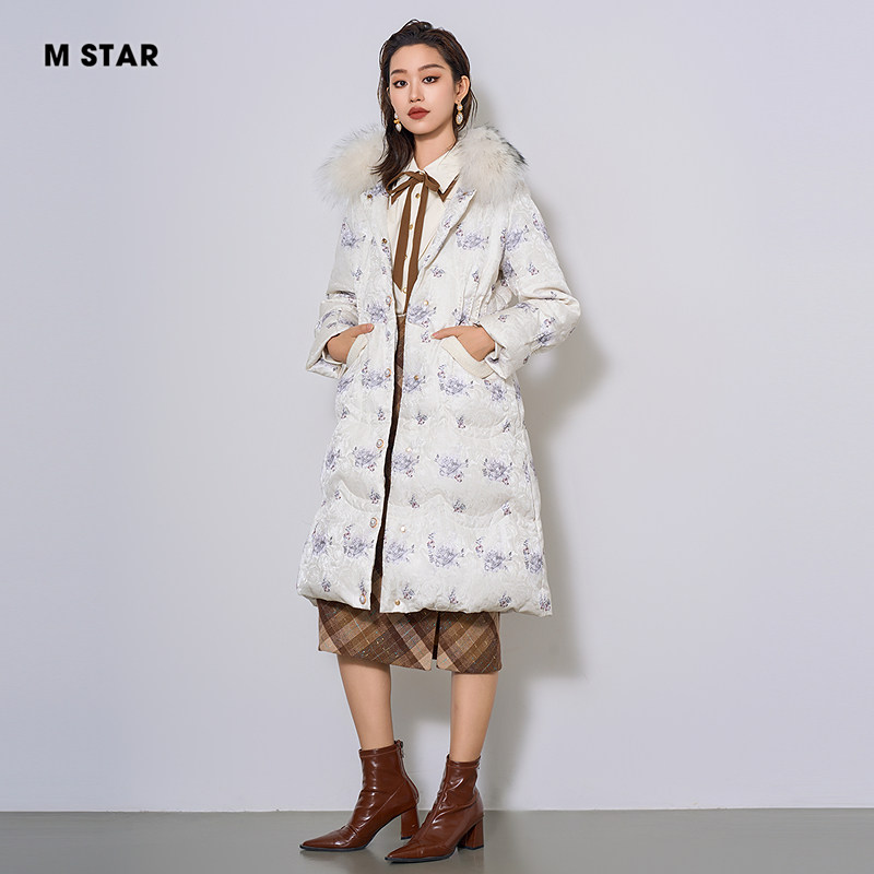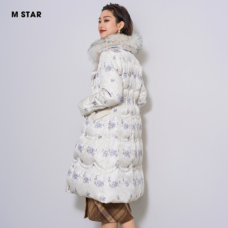 📚 M STAR冬季毛领长款印花鹅绒羽绒服女款收腰加厚保暖时尚