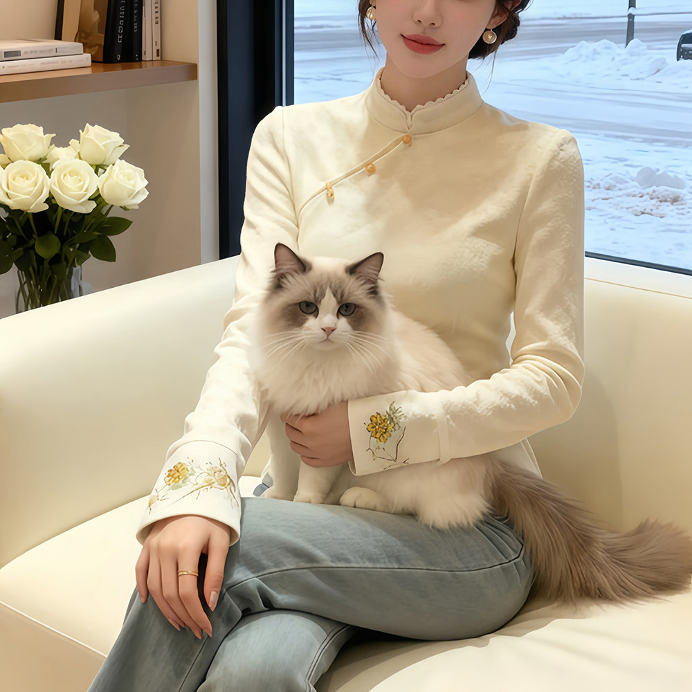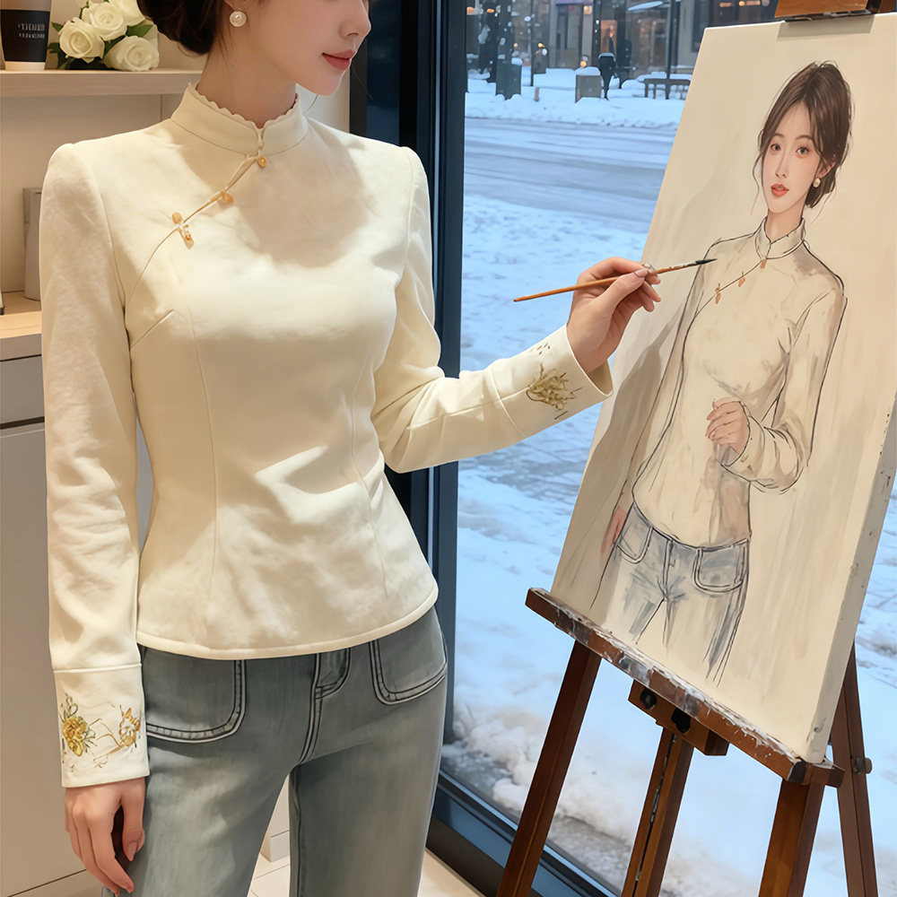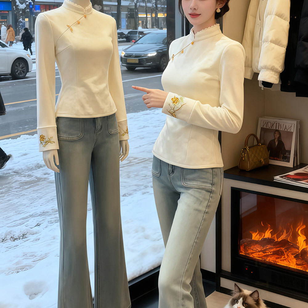 📚 新中式国风提花刺绣立领长袖上衣秋冬新款修身内搭加绒加厚打底衫