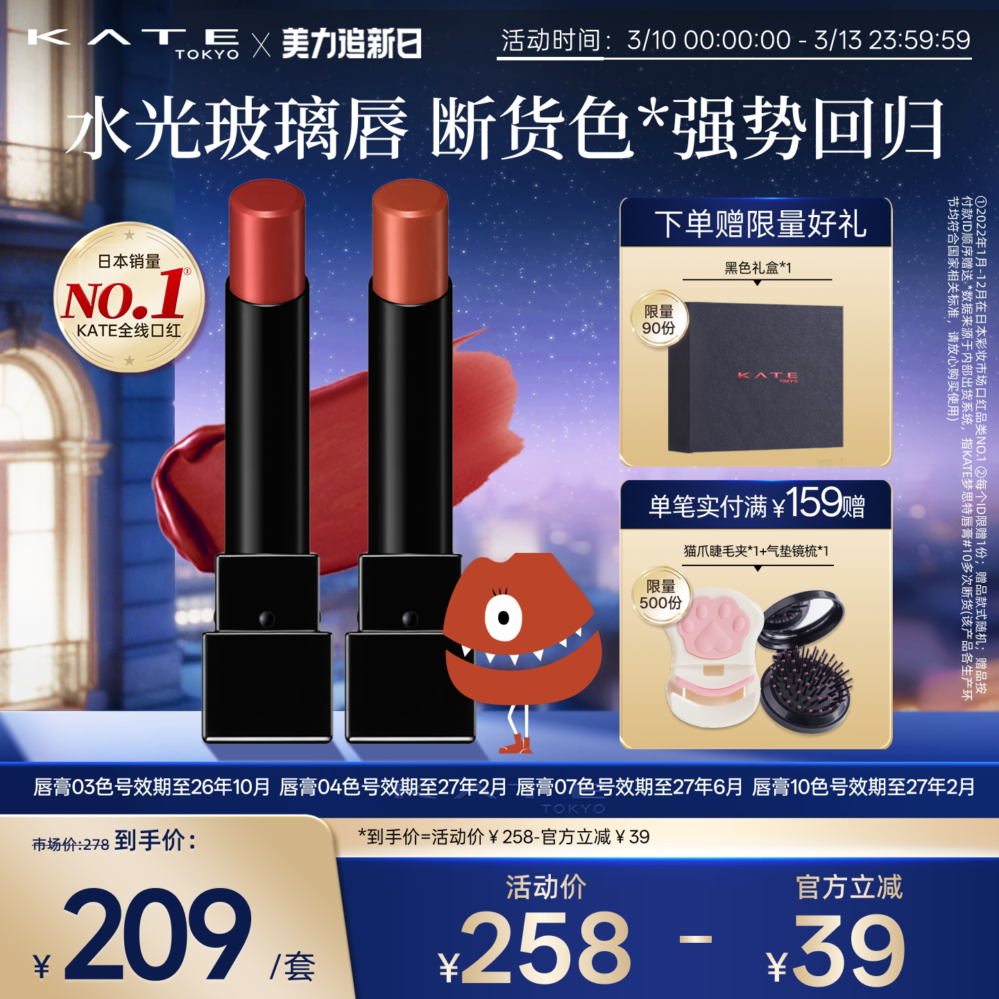 57¥ CZ225 fWWxUv4raCz¥ https://m.tb.cn/h.iWHweeK KATE/凯朵双支梦思特唇膏显气色滋润怪兽口红持妆持久保湿不沾杯 --------------------- 【原售价】278元 【现售价】258元。