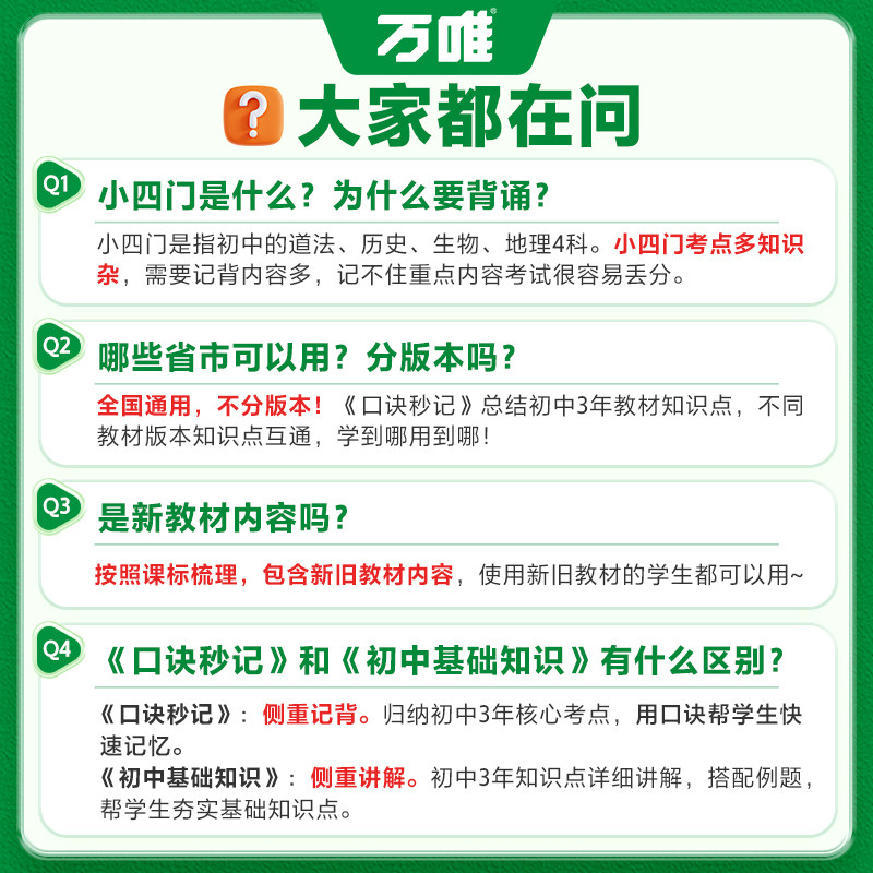 📚 2026万唯中考口诀秒记初中小四门必背知识 提分技法初一初二初三789年级道法历史生物地理政治基础知识手册生地会考万维教育