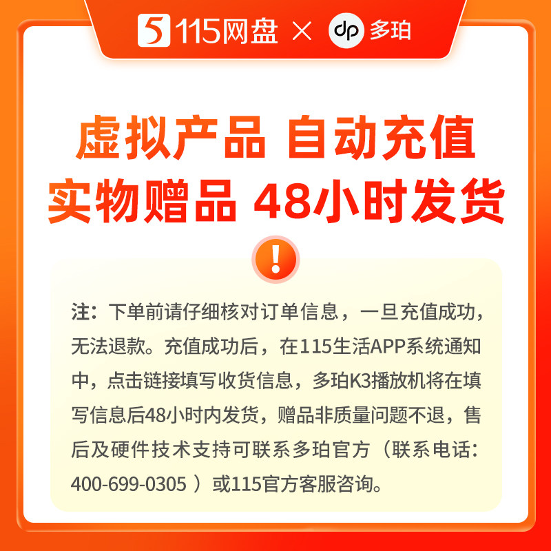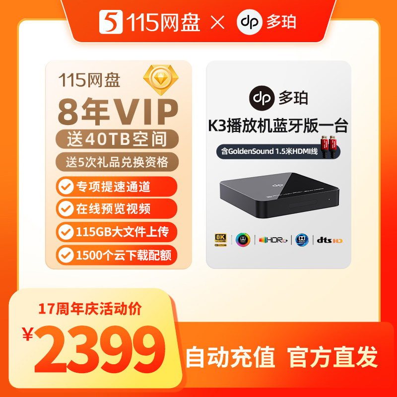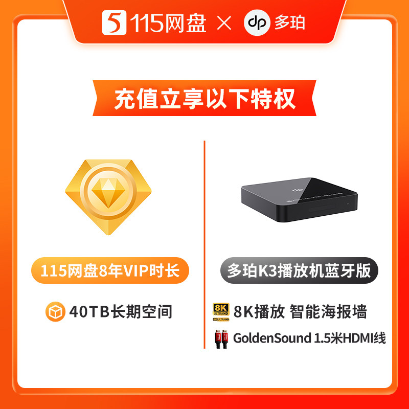 📚 115网盘8年VIP加赠多珀K3播放机蓝牙版 专享提速通道 自动充值