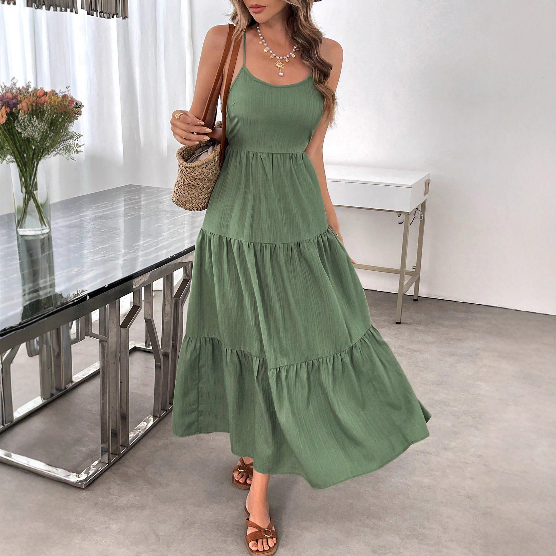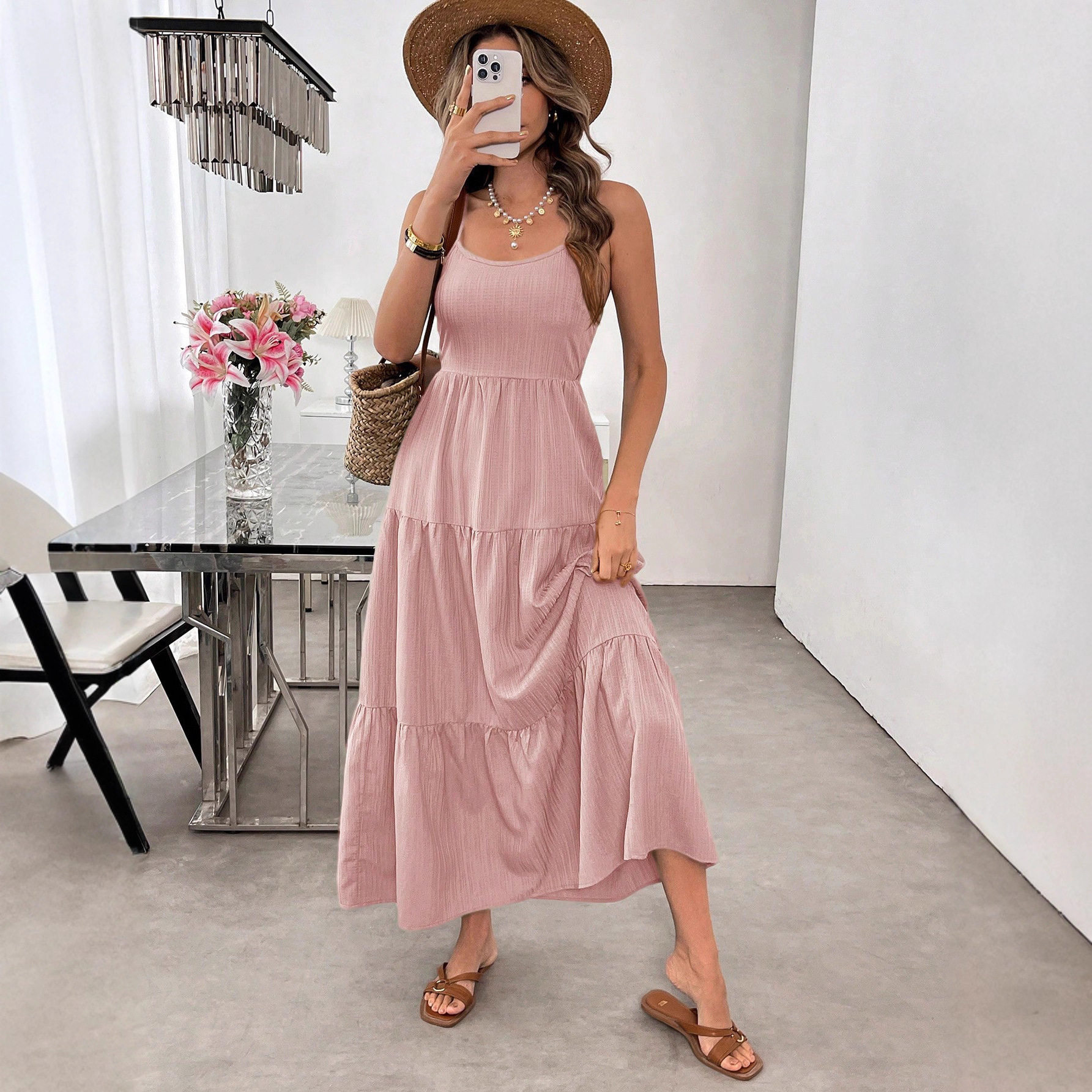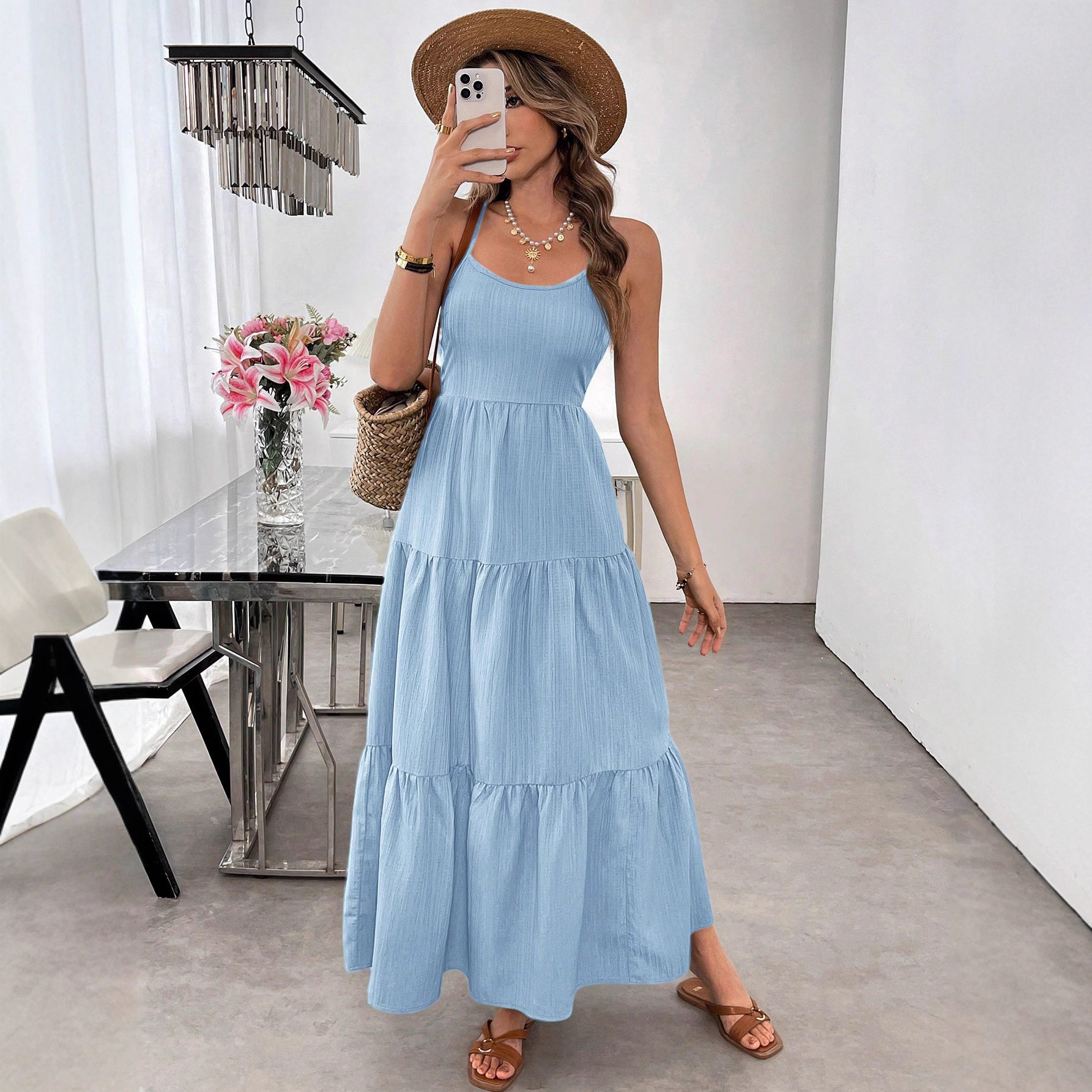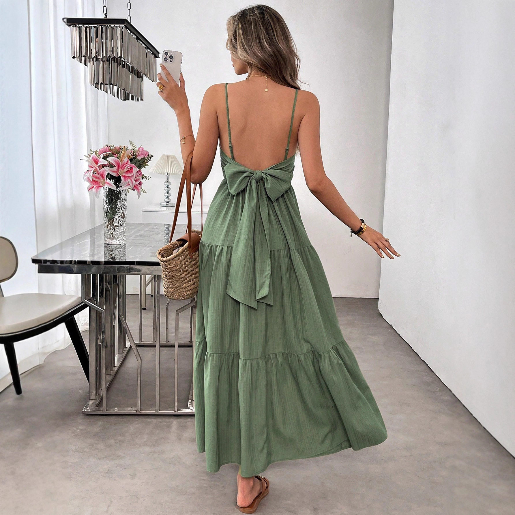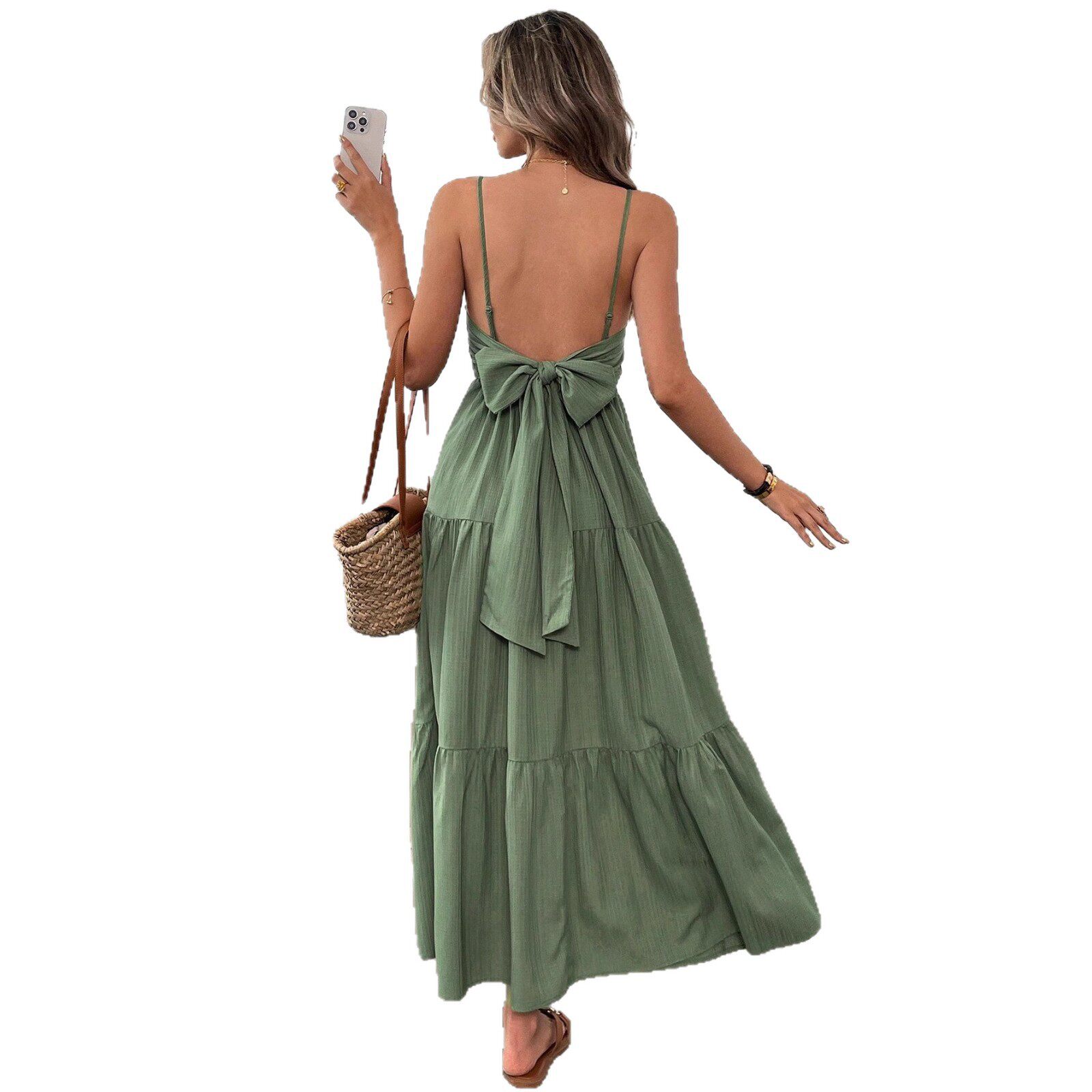 📚 spaghetti strap bow Sling long dress waist cincher woman女裙