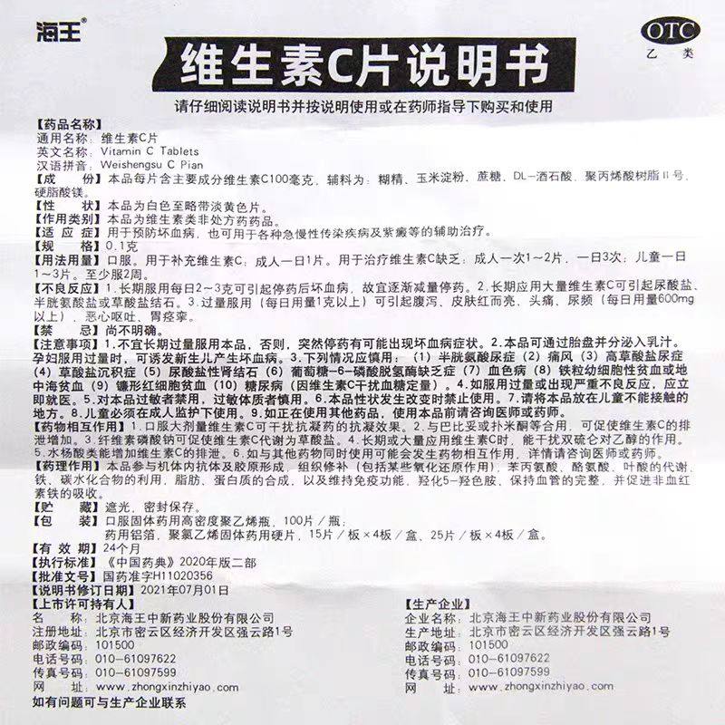📚 海王维生素C片100片*1瓶/盒防坏血病连锁药房直发假一赔十
