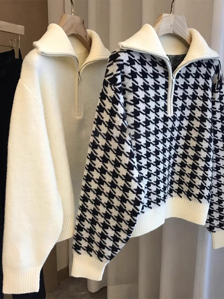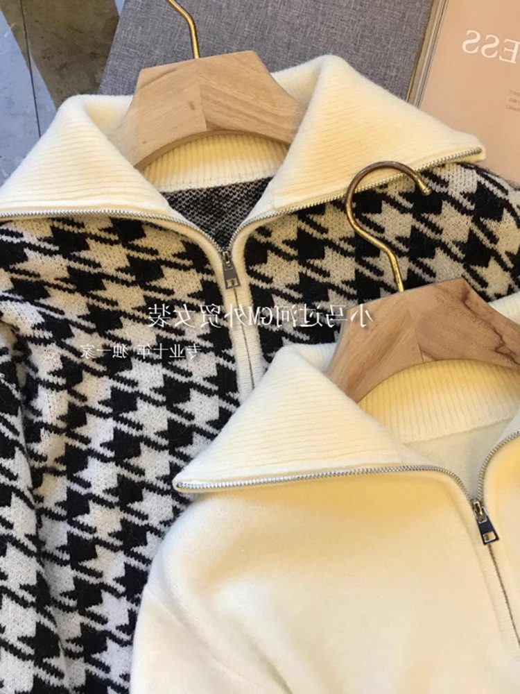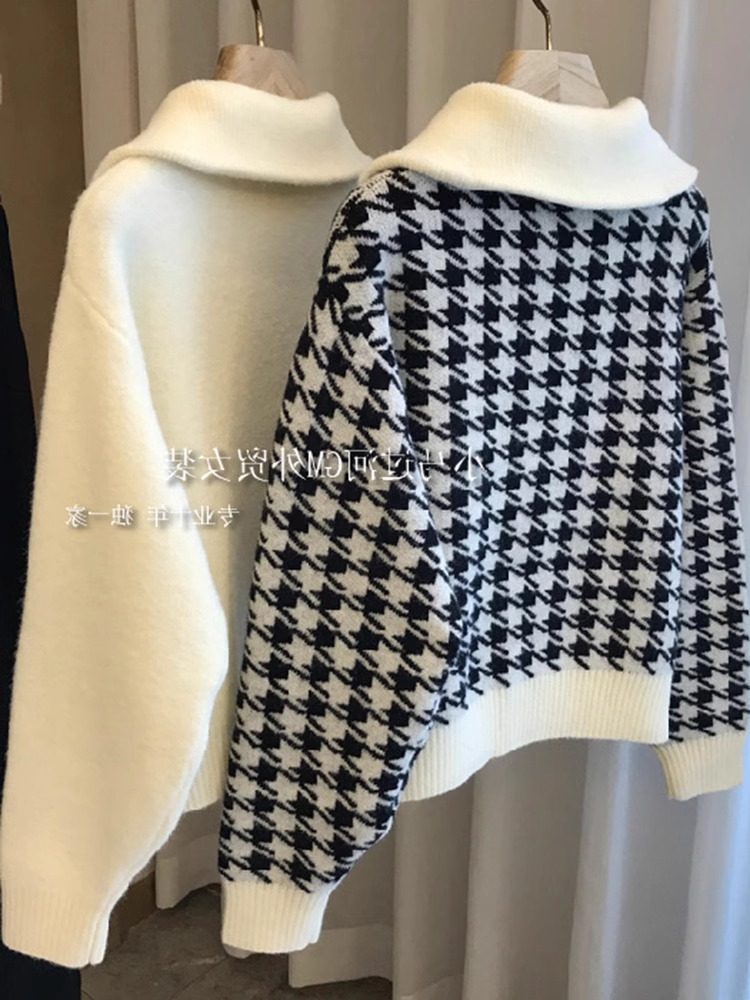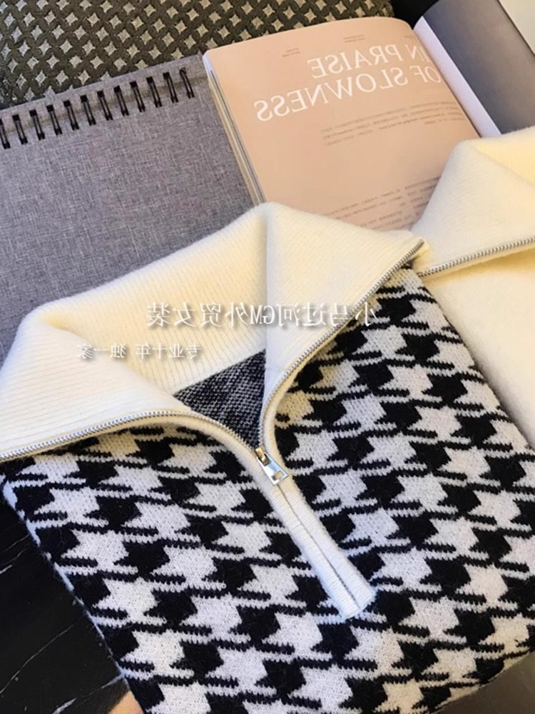 📚 广州十三行女装高级感千鸟格半拉链毛衣女秋冬慵懒风加厚翻领上衣