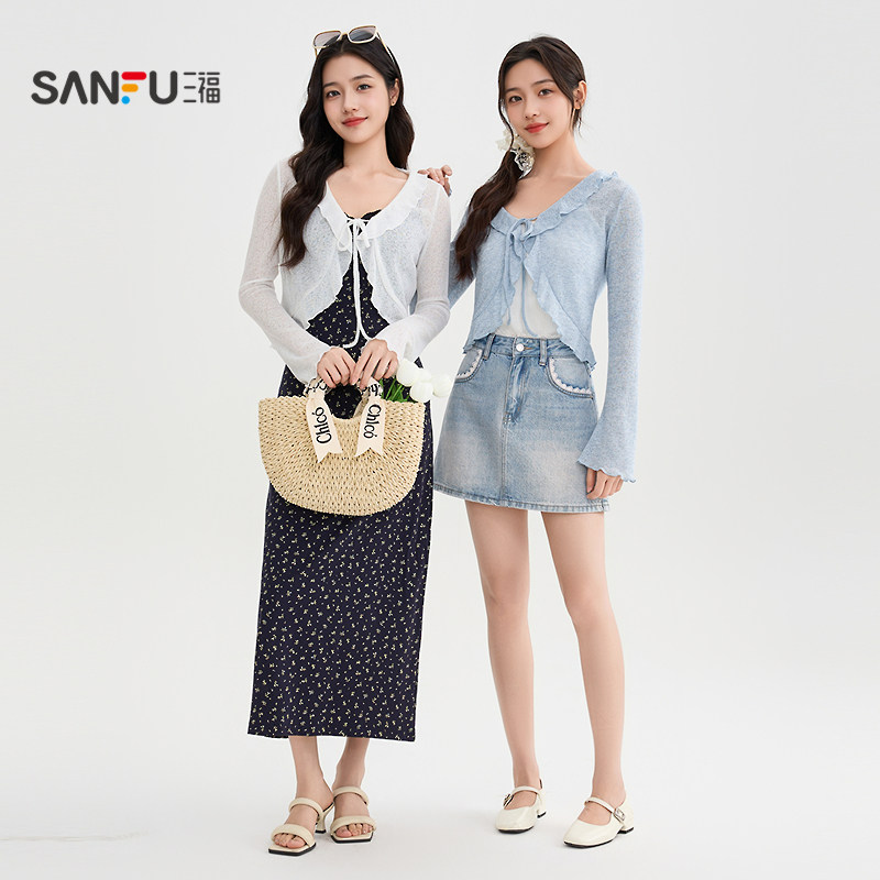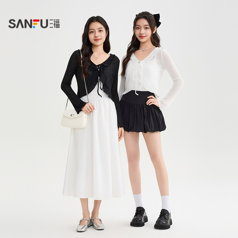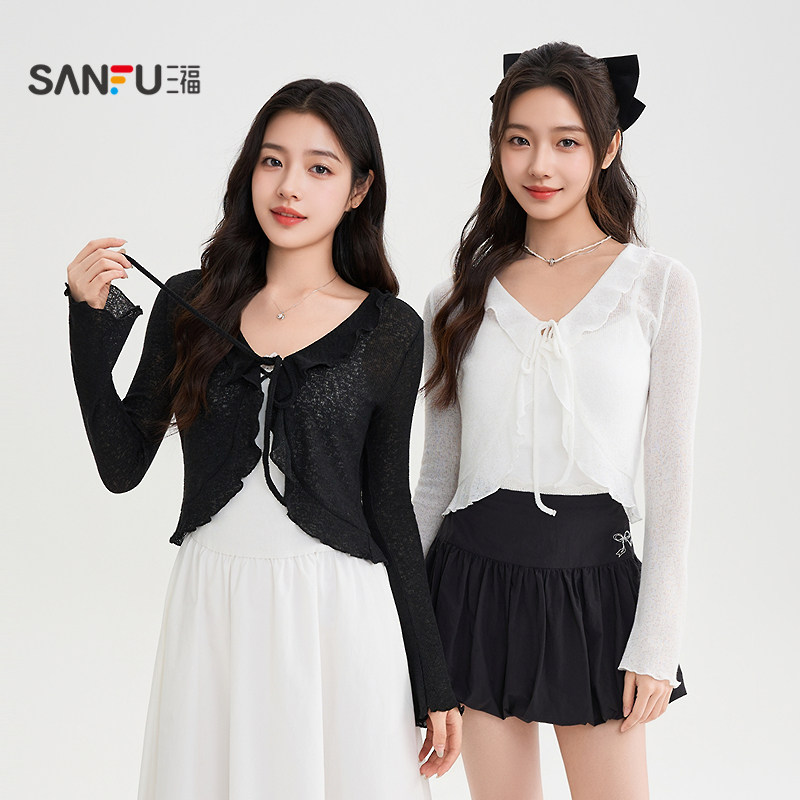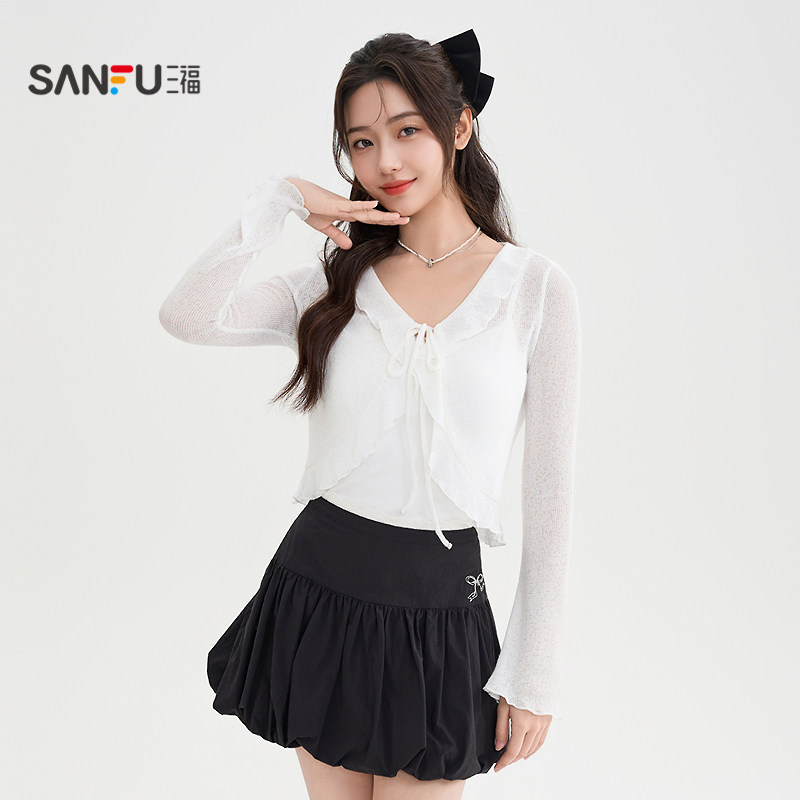 📚 三福长袖T恤女2026新款春季喇叭袖优雅V领微透开衫搭裙子上衣女装