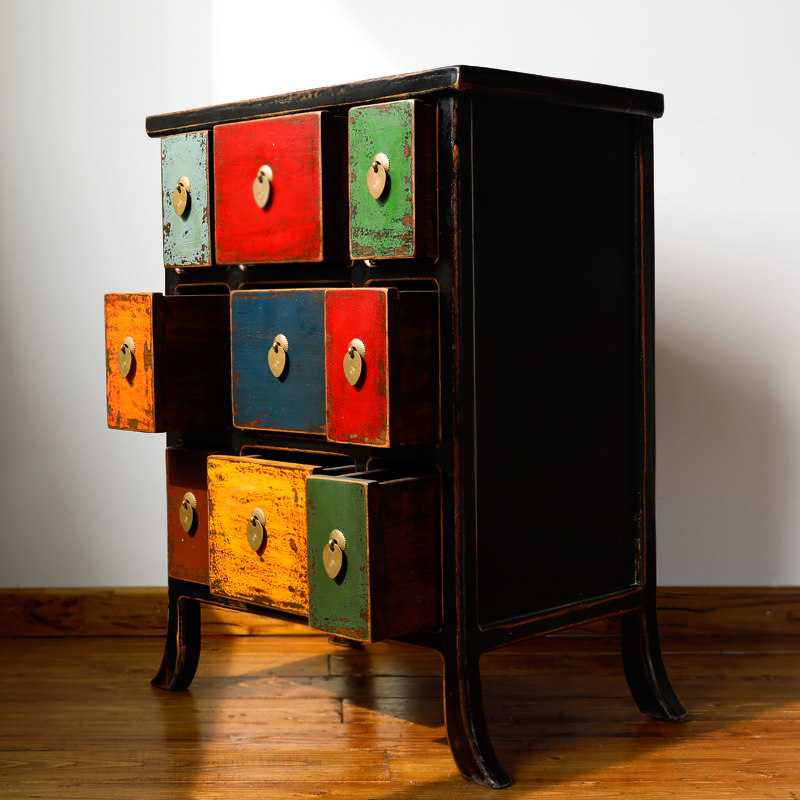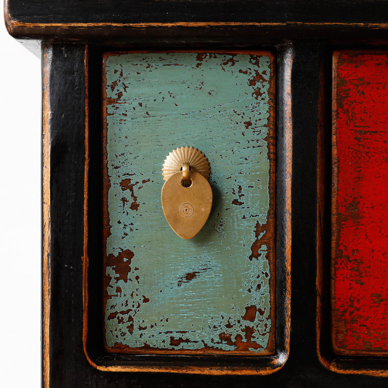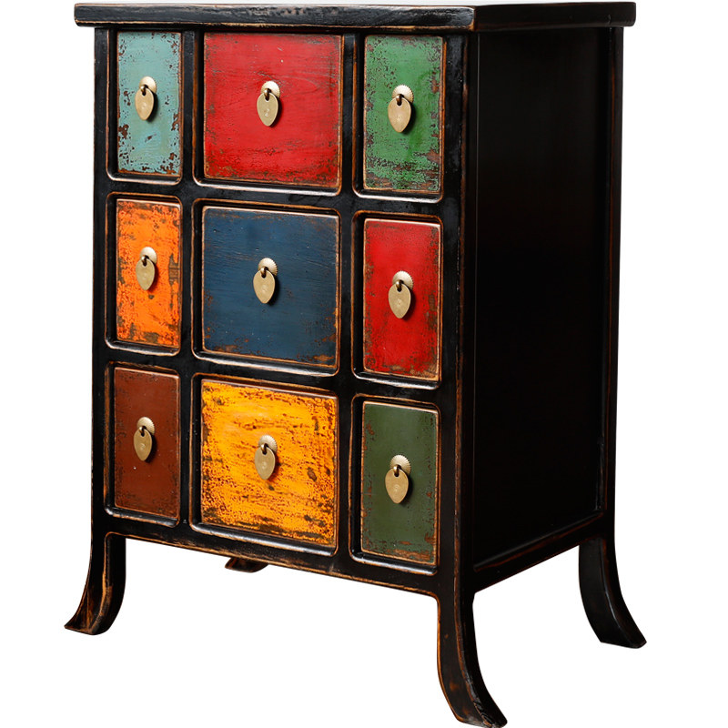 📚 复古做旧实木九斗柜多功能玄关储物古朴彩漆矮边柜分类抽屉收纳柜
