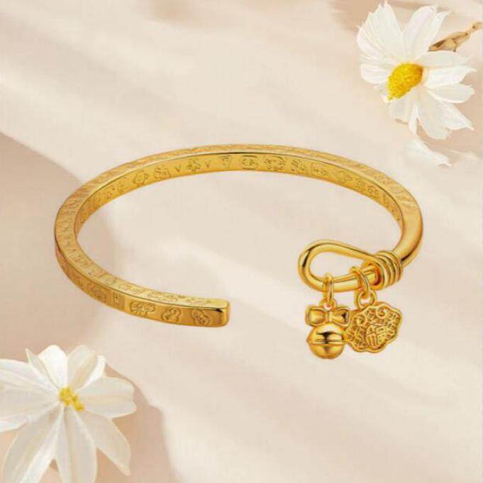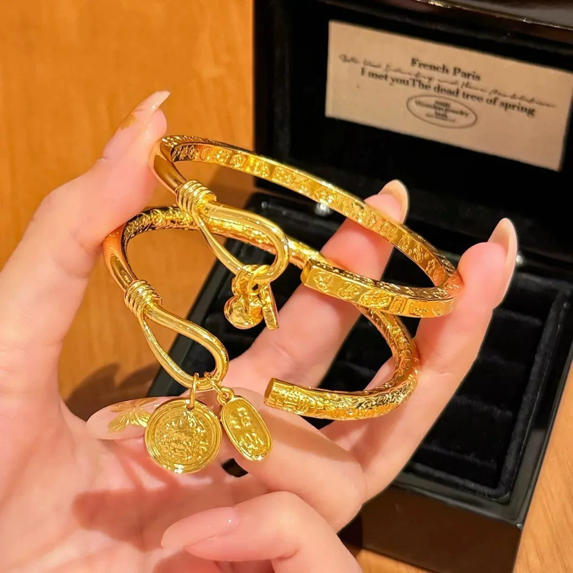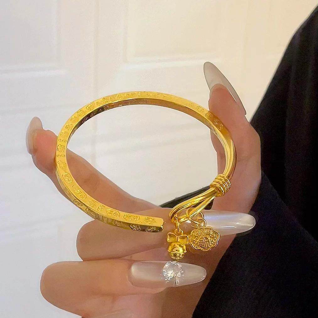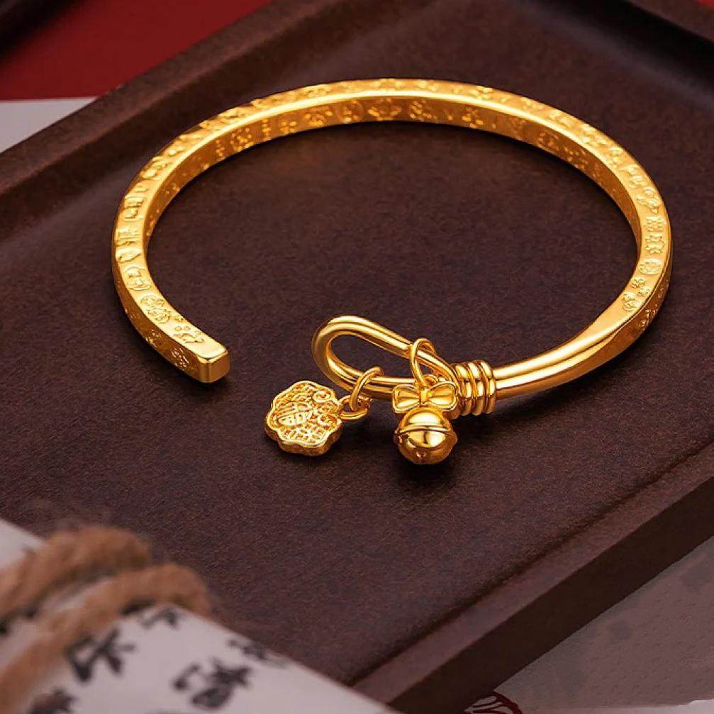 📚 吉言铃铛福字开口沙金手镯女仿真黄金实心新中式如意手环仿三金