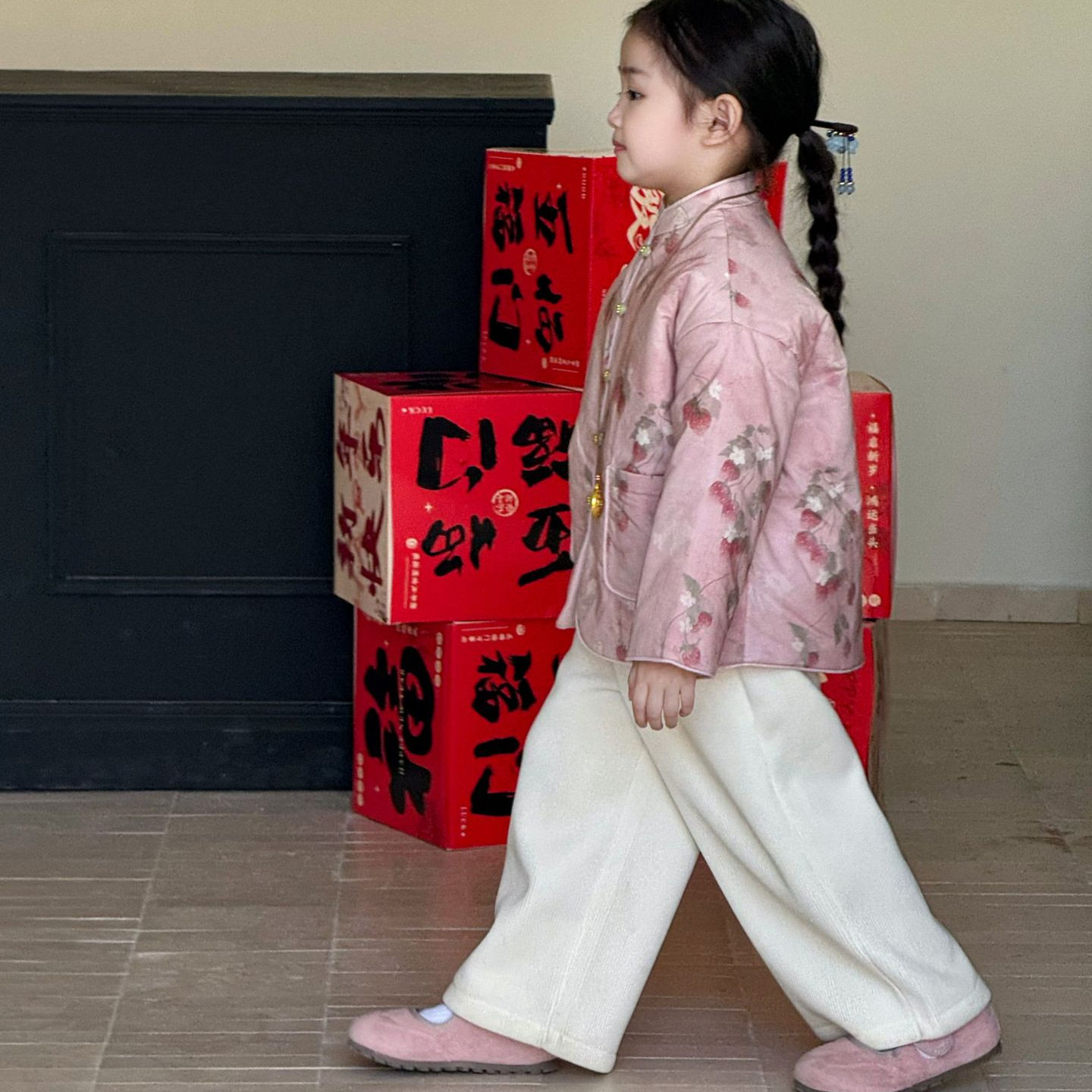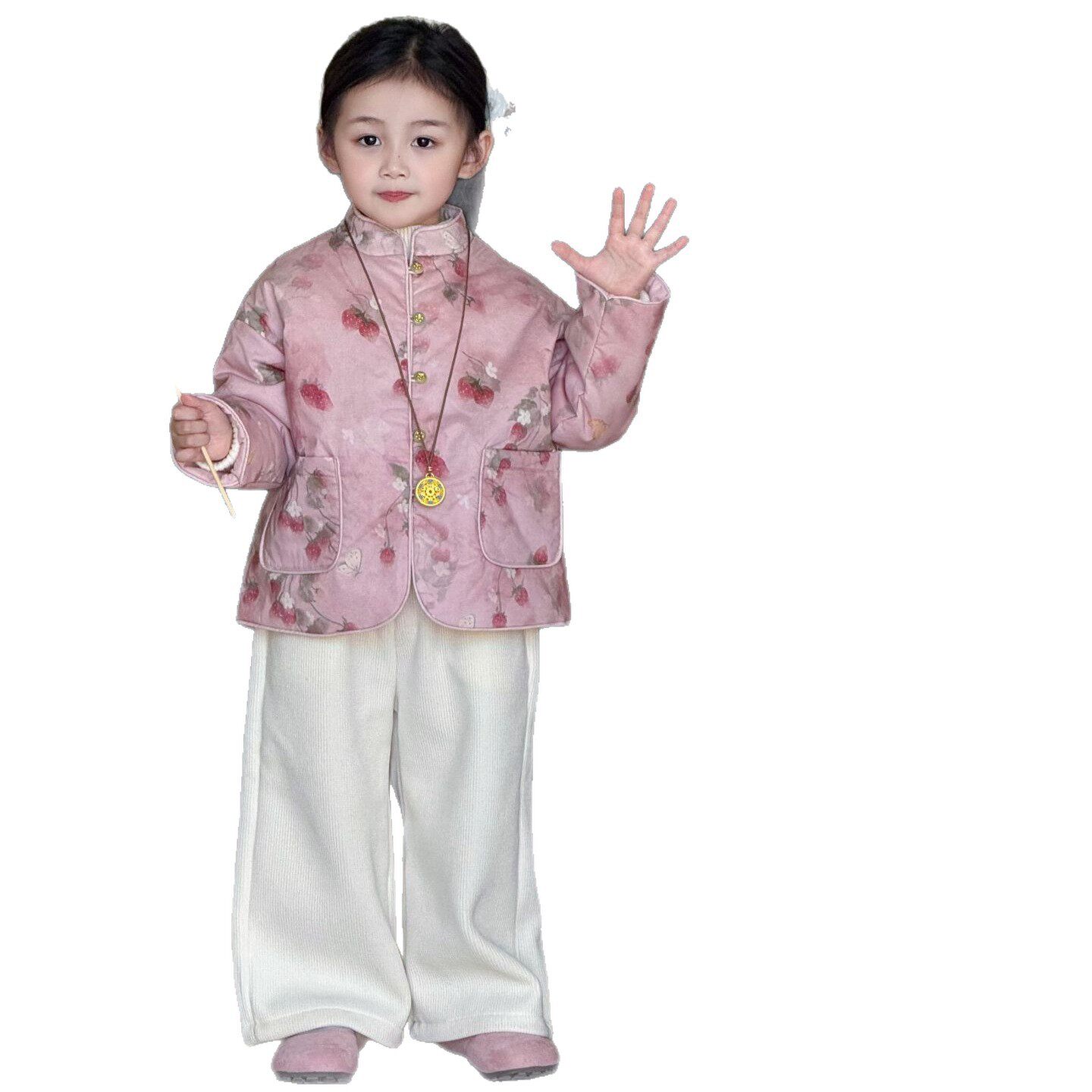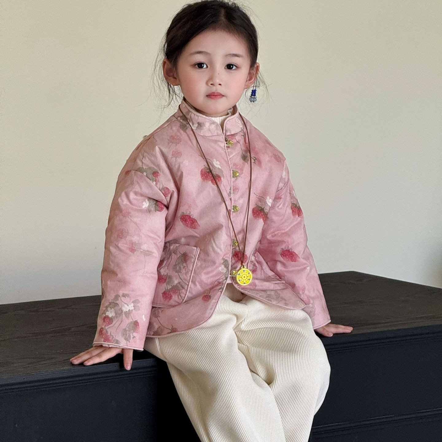 📚 2025冬季新款童装 新中式童装 女童水墨草莓印染棉衣 盘扣拜年服