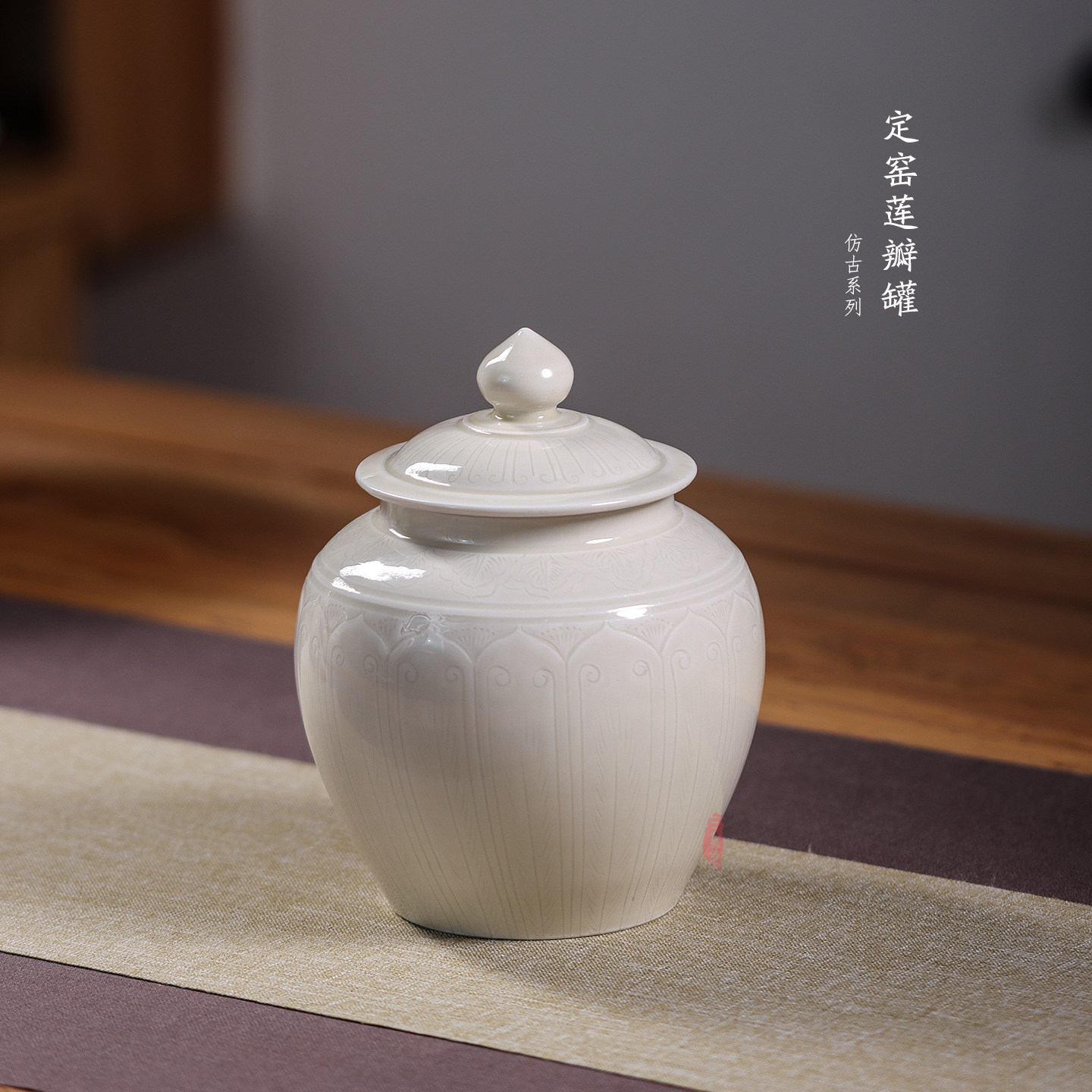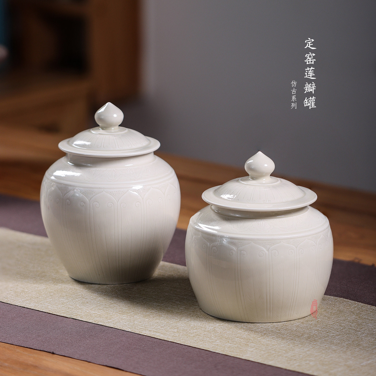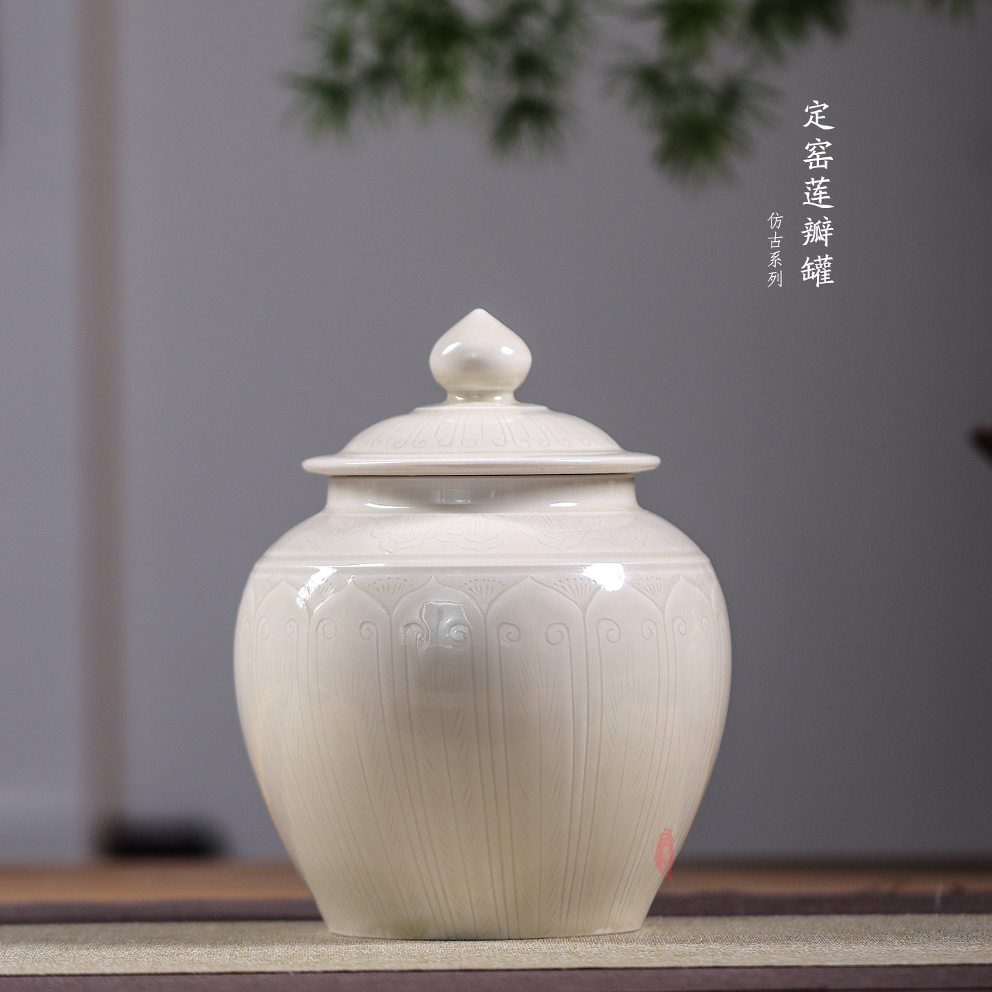 📚 三义成定瓷白釉仿古全手中式划花莲纹菩提叶文盖罐陶瓷茶叶罐摆件