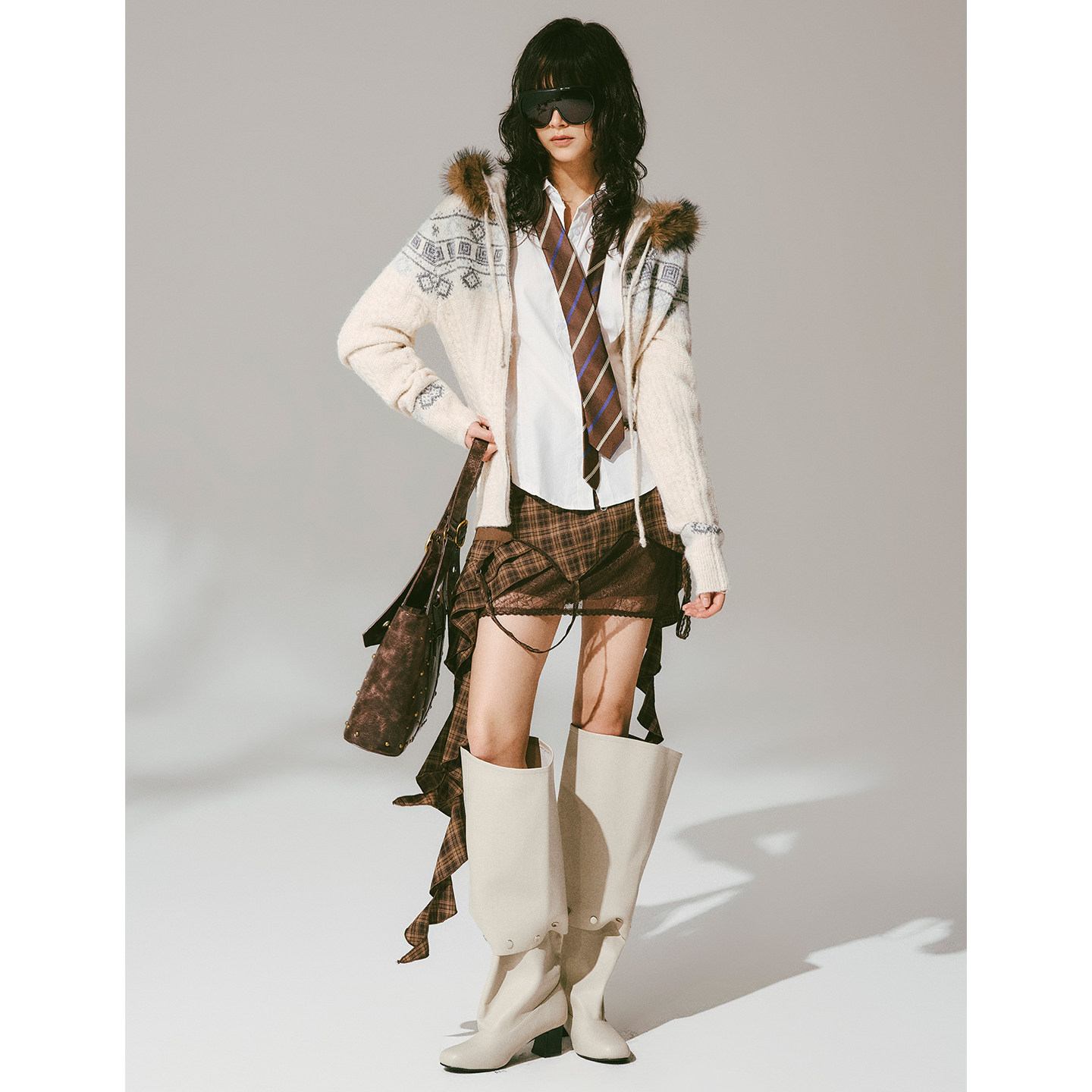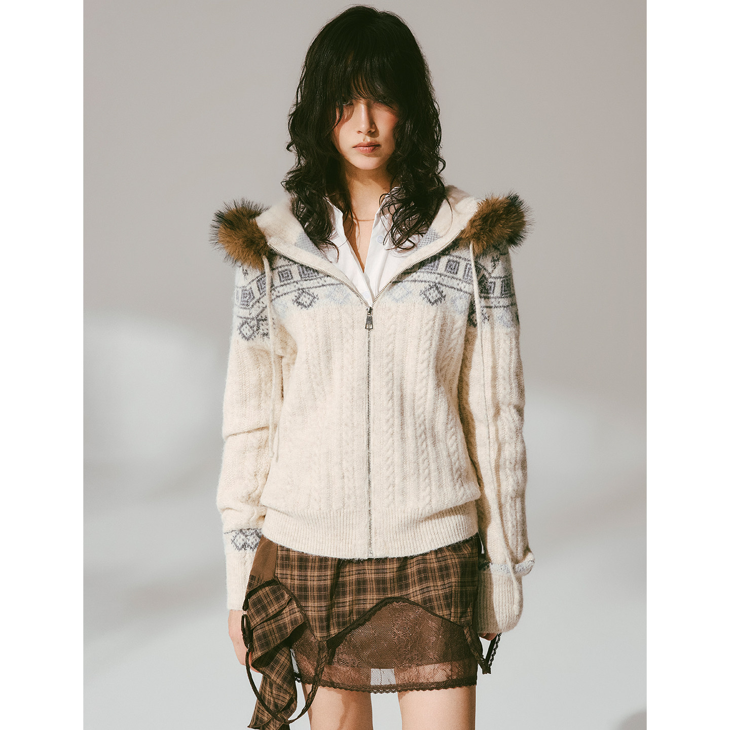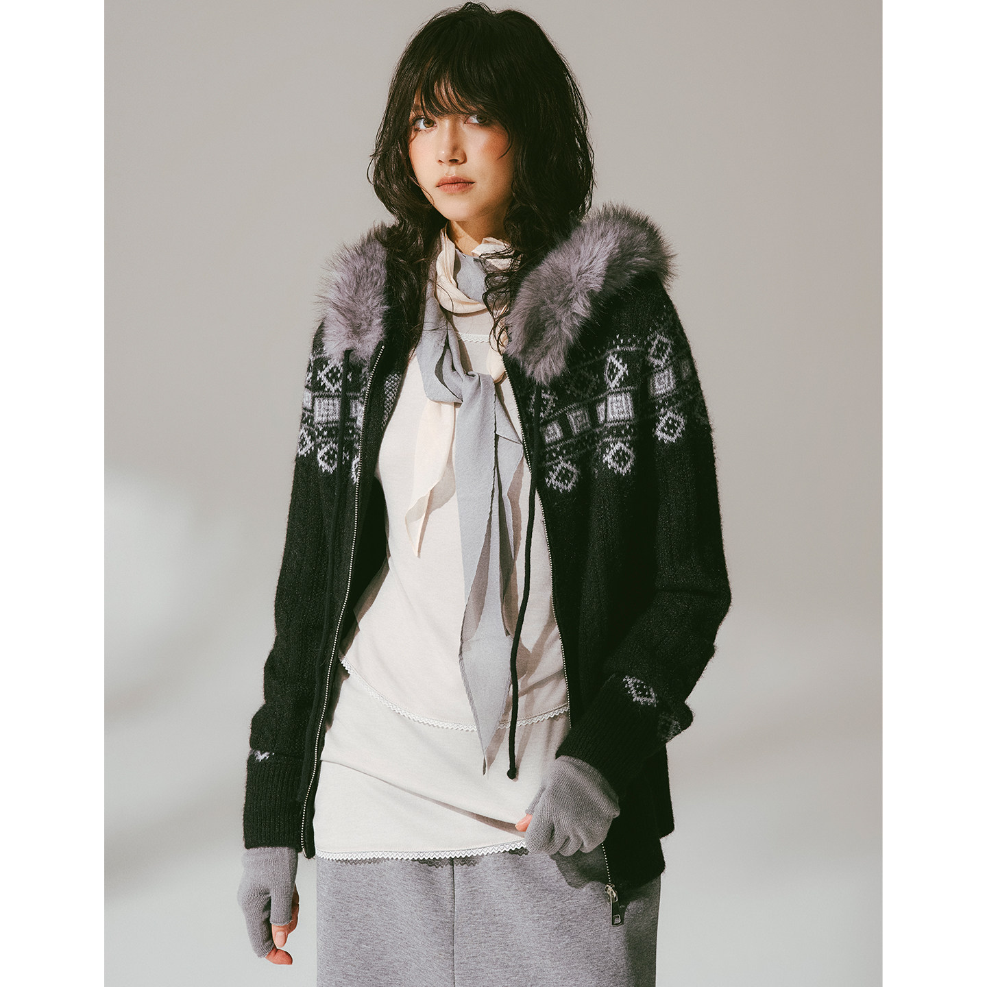 📚 USS 费尔岛提花毛衣女秋冬毛领复古宽松显瘦保暖针织连帽开衫外套