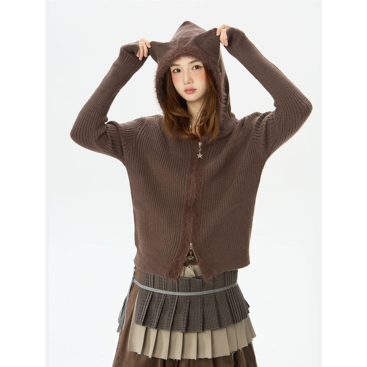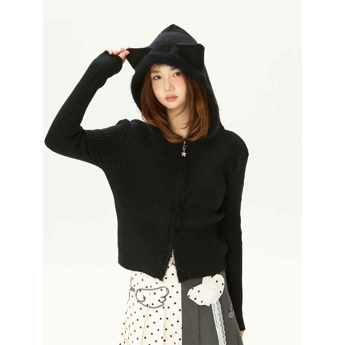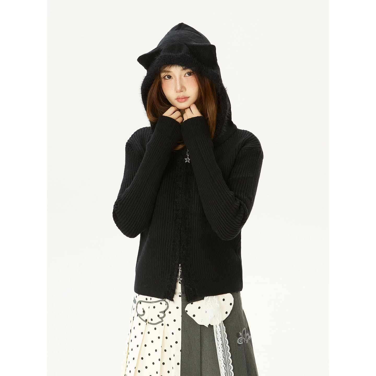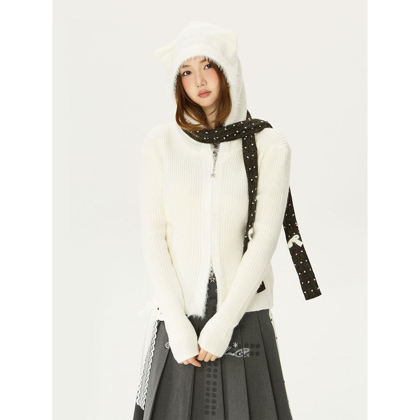 📚 Double L2 白色奶fufu猫耳朵毛衣外套女秋冬修身短款连帽针织开衫