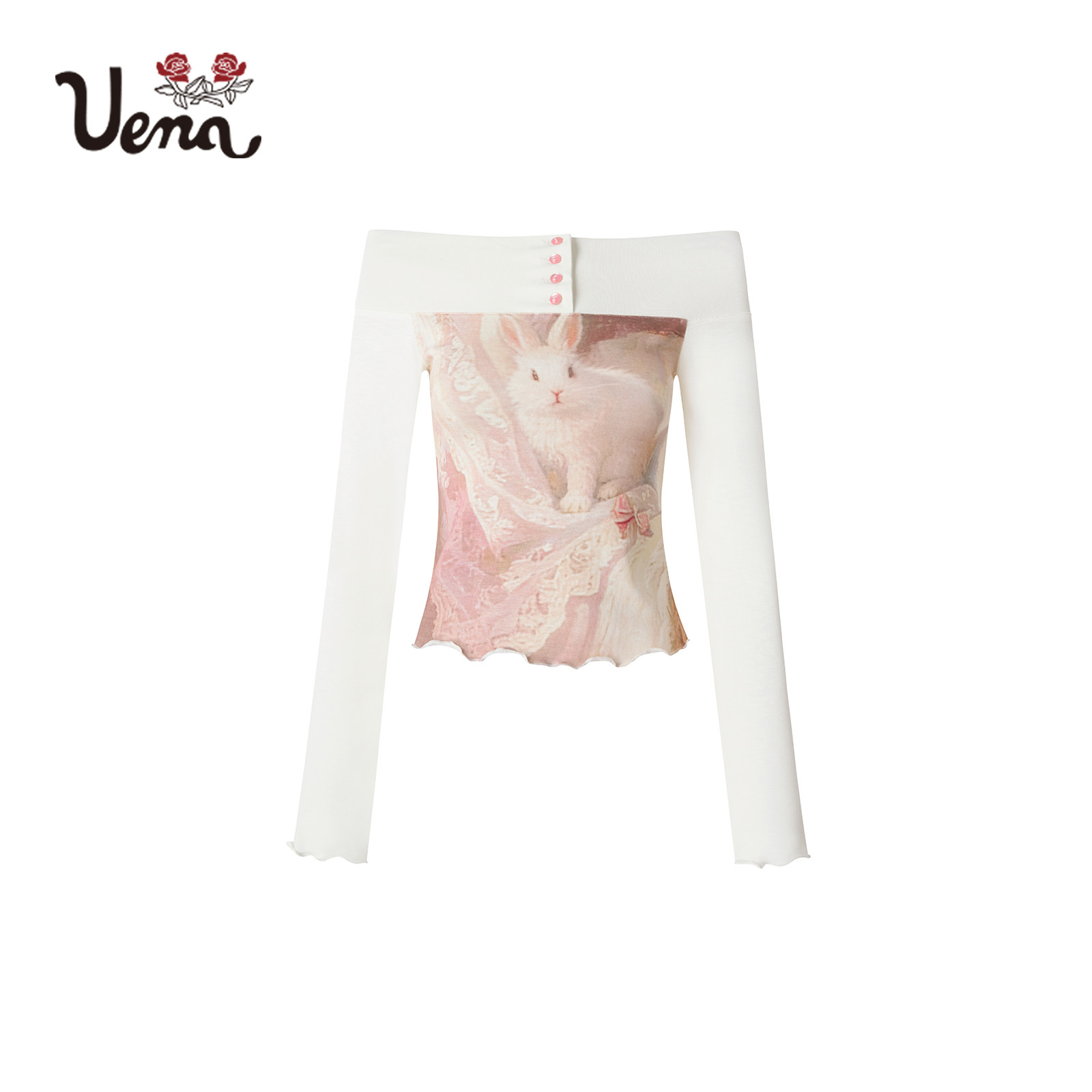 📚 【早樱兔兔】Uena粉白撞色兔子印花胸前半开扣一字肩短款长袖T恤
