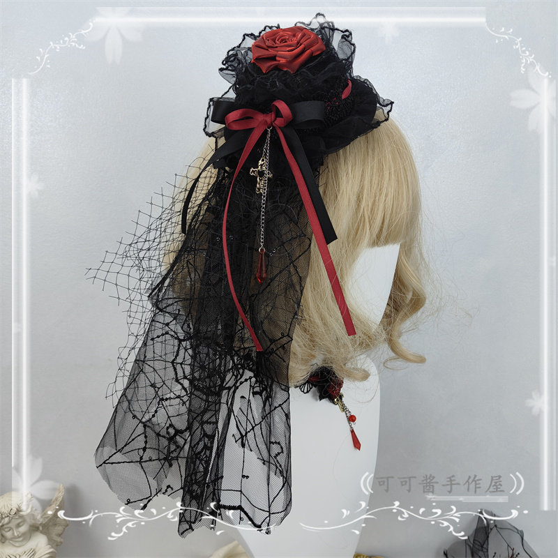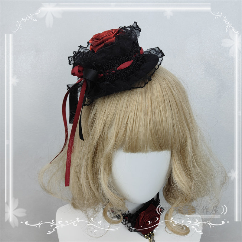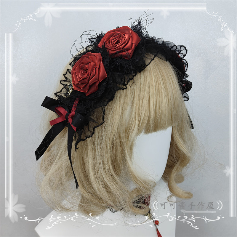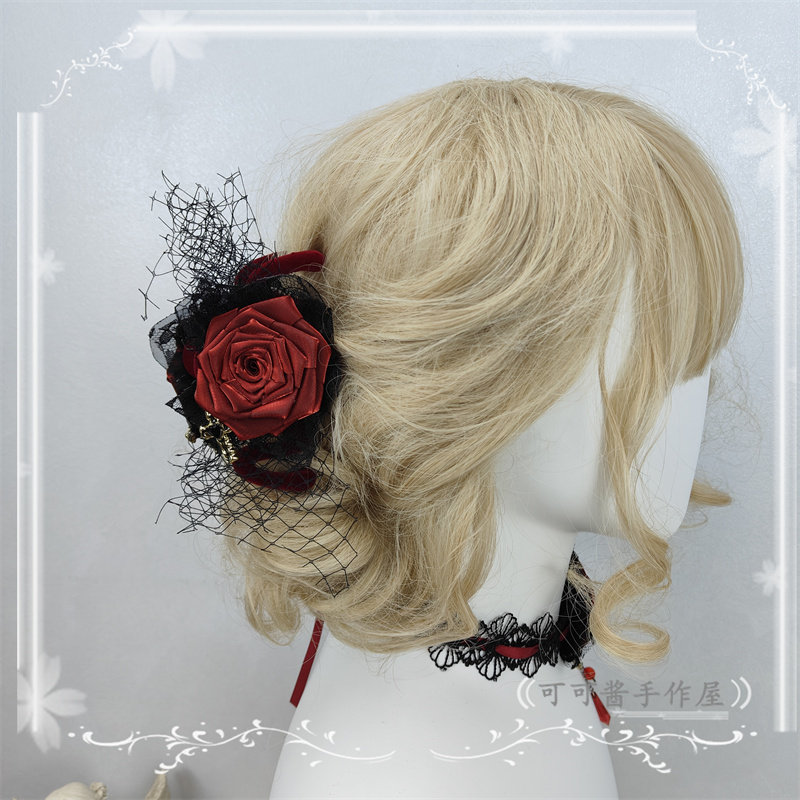 📚 原创手作暗黑哥特风酒红色玫瑰花发夹洛丽塔边夹蕾丝网纱头饰硬妹