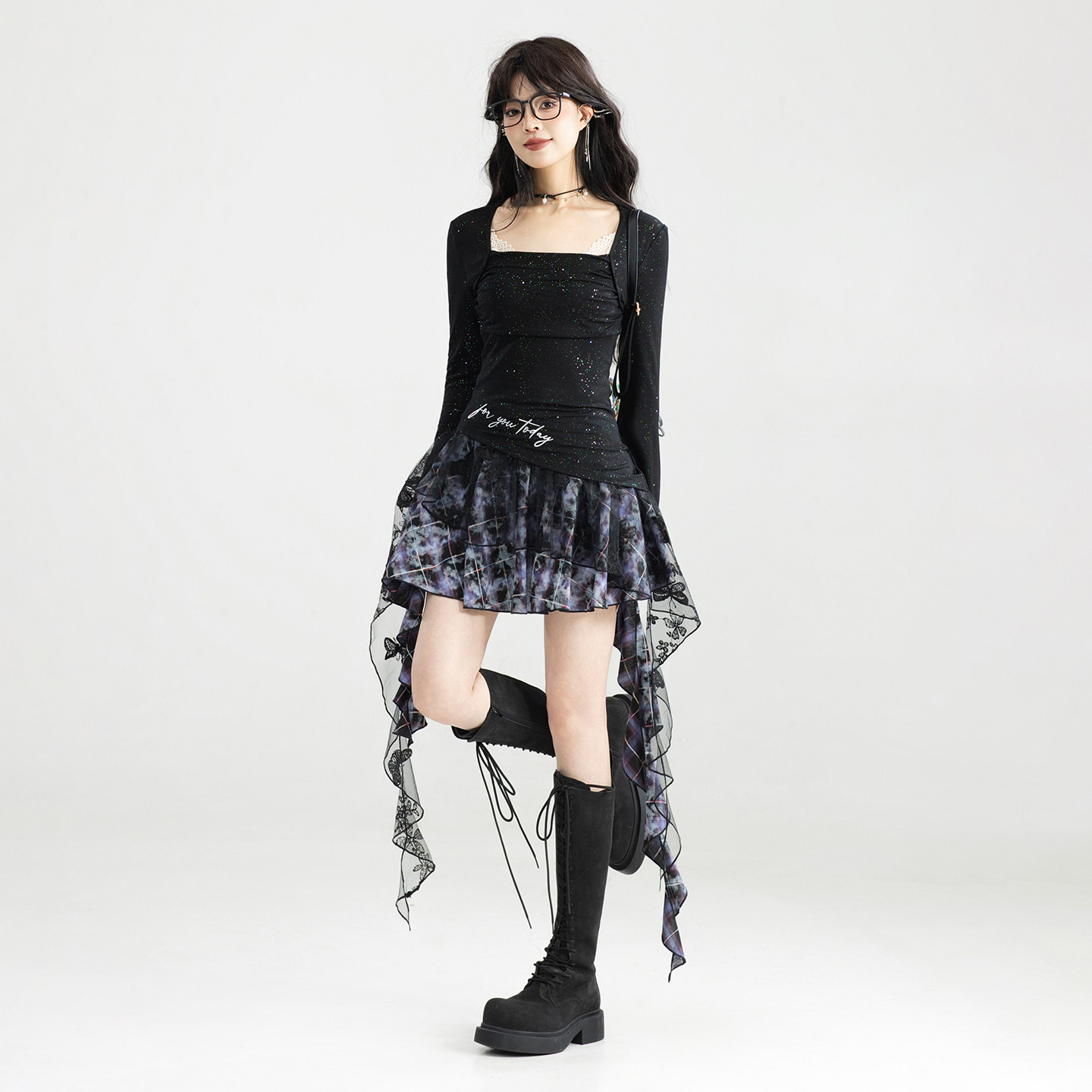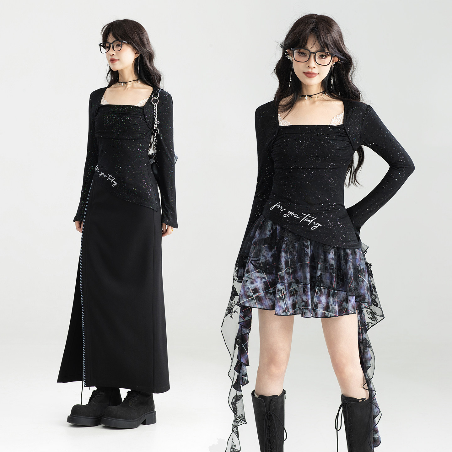 📚 KEIKO 性感法式黑色方领上衣女26春季内搭外穿不规则修身长袖T恤