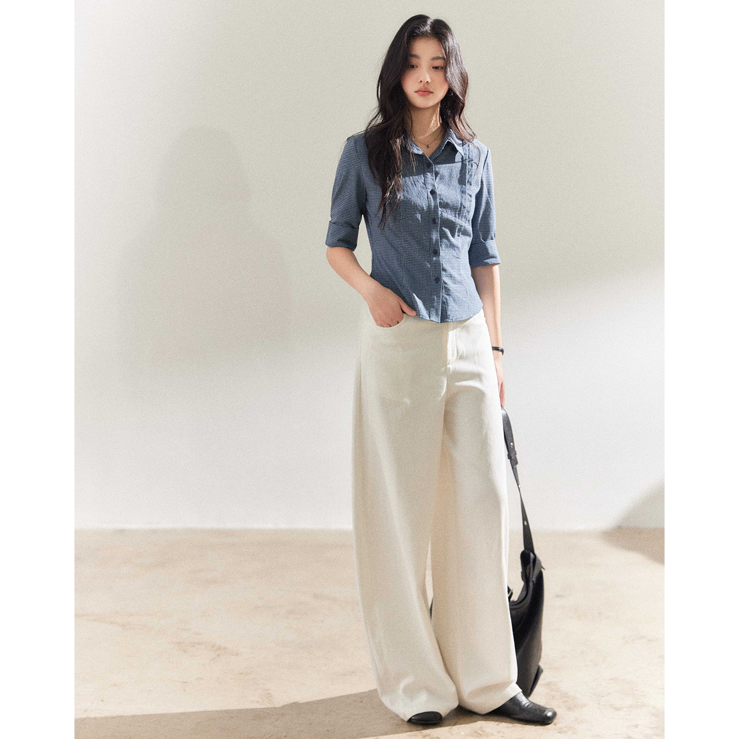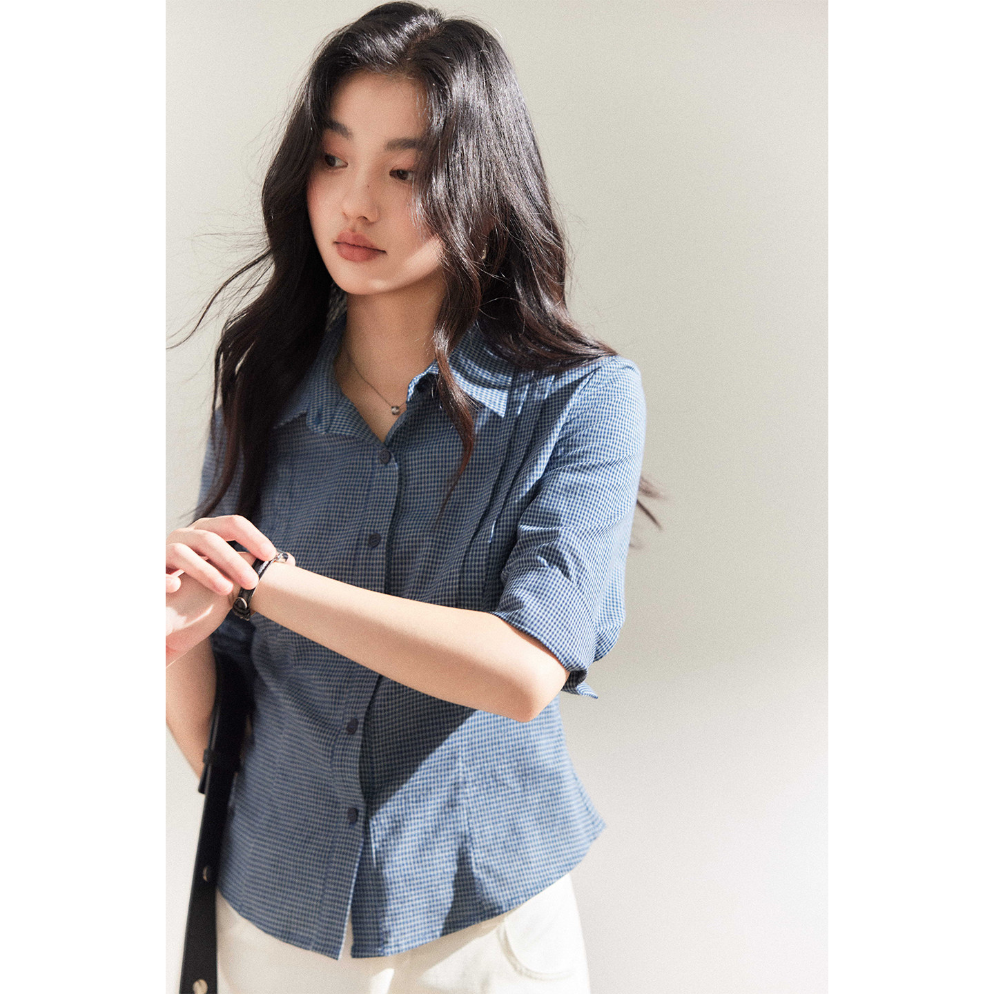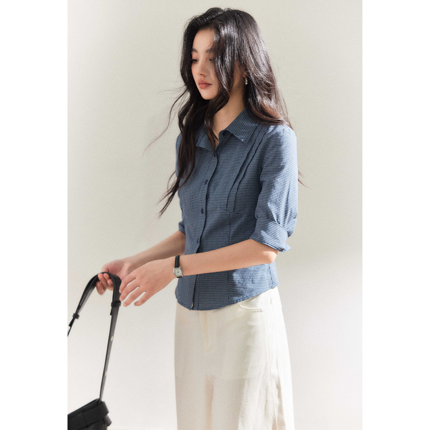 📚 贰羊设计【拟星】复古蓝白格正肩衬衣女修身显瘦棉感通勤质感上衣