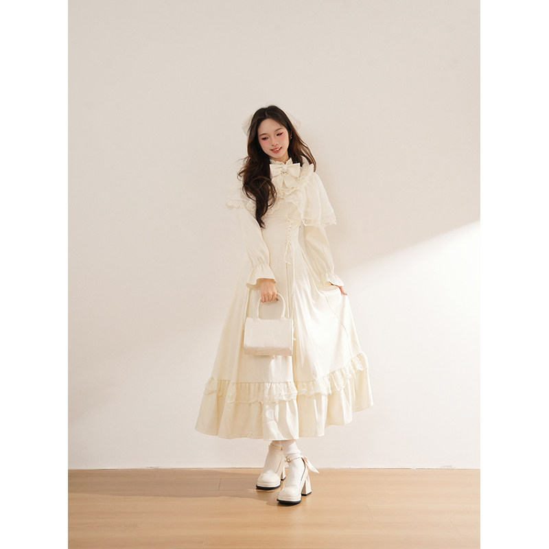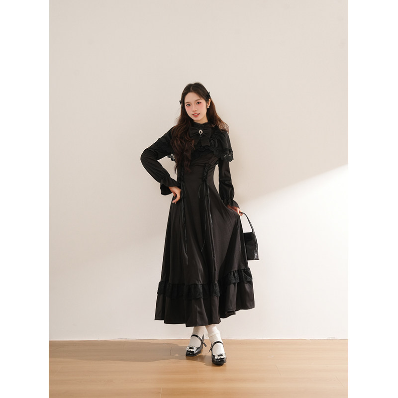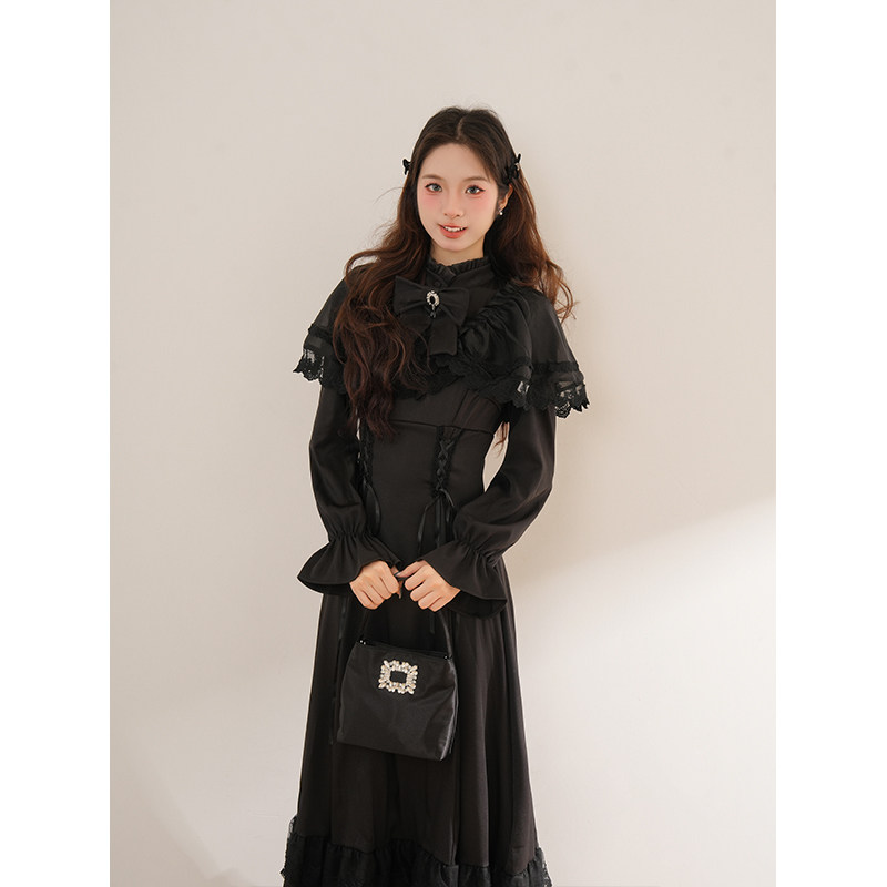 📚 【昼夜】 法式新款哥特清楚系长袖蝴蝶结连衣裙收腰气质显瘦长裙