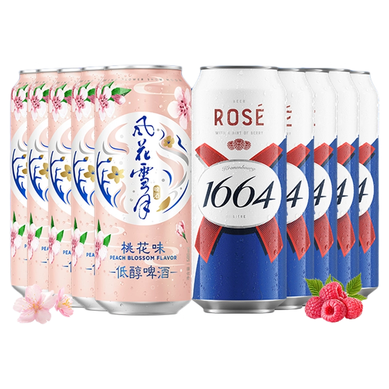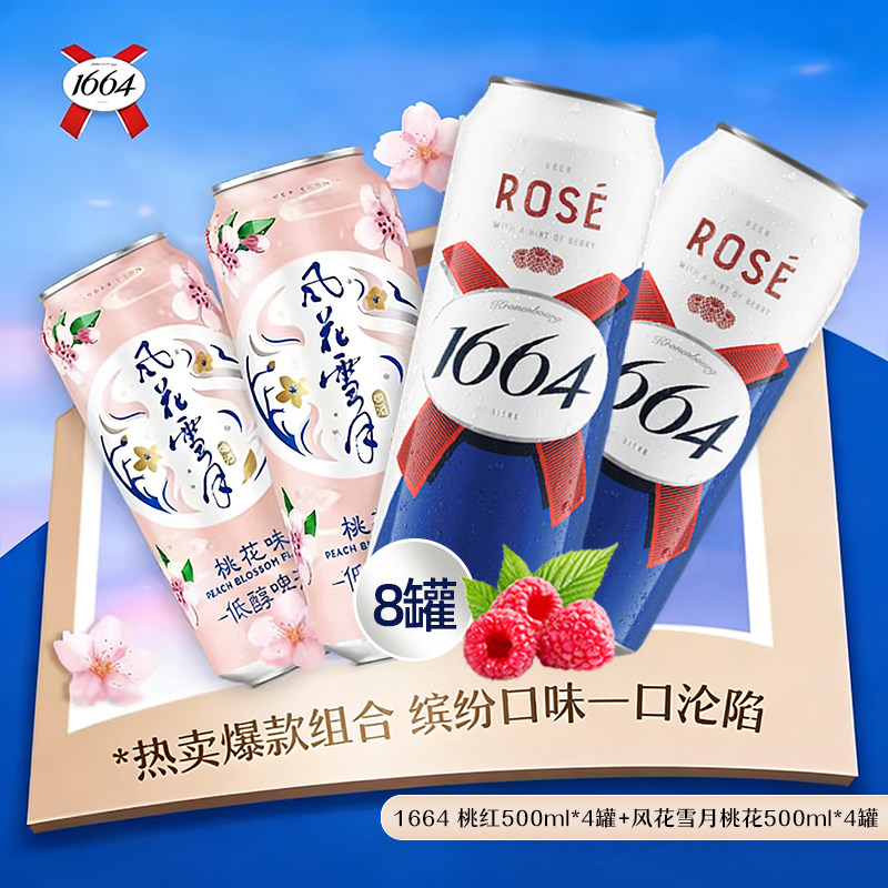 📚 【临期】1664桃红啤酒500ML*4罐+风花低桃花500ML*4罐26年3月到期