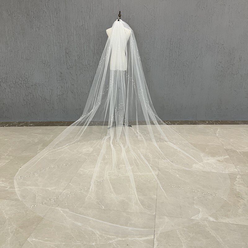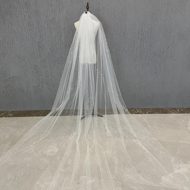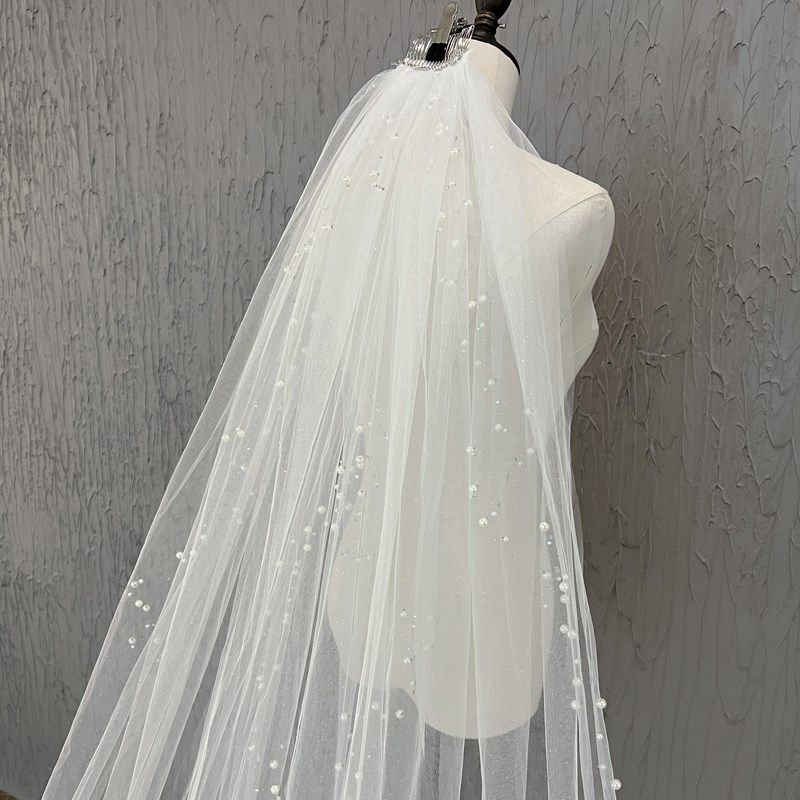 📚 新娘主婚纱头纱长款单层样片珍珠拍照跟妆影楼摄影高级感森系头饰