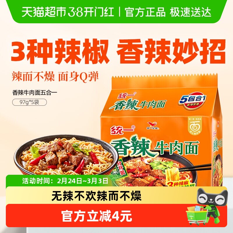 📚 统一方便面香辣牛肉面泡面五合一97g*5袋就要辣得过瘾速食