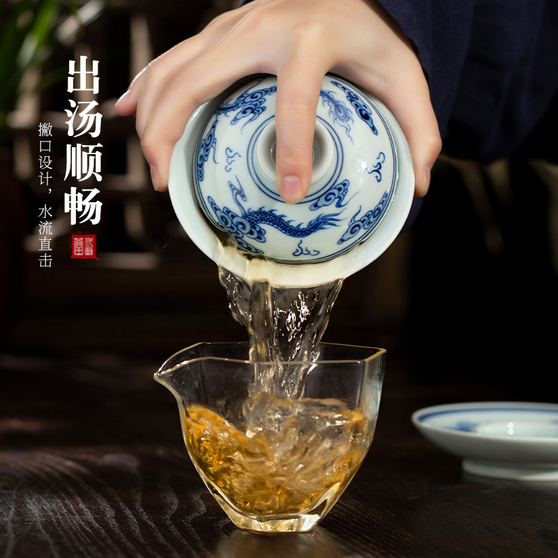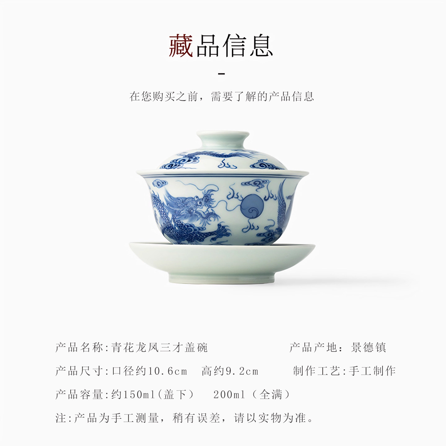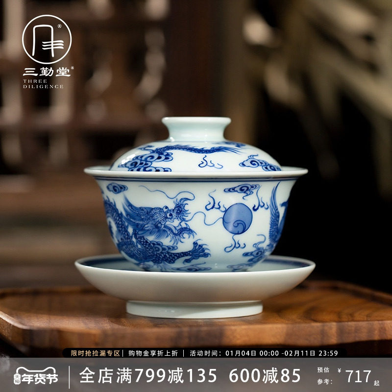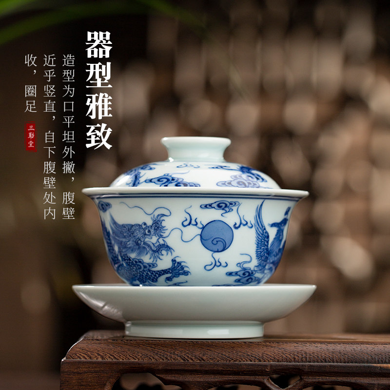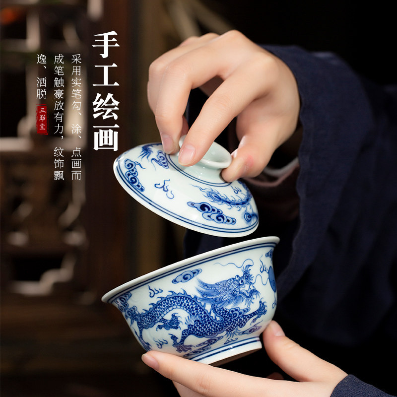 📚 三勤堂青花三才盖碗手绘龙凤单个陶瓷茶碗中式高档功夫茶具敬茶碗