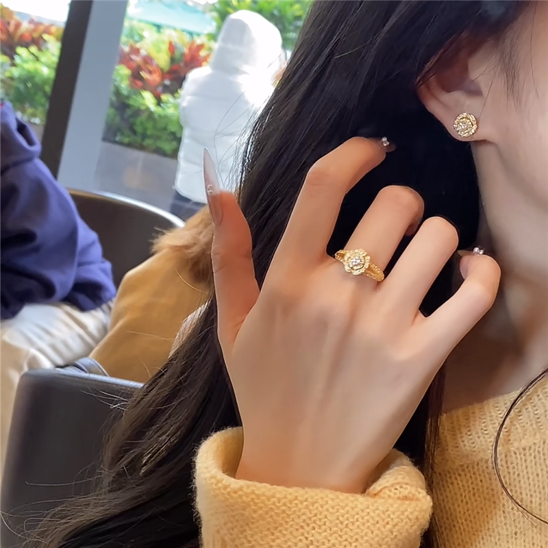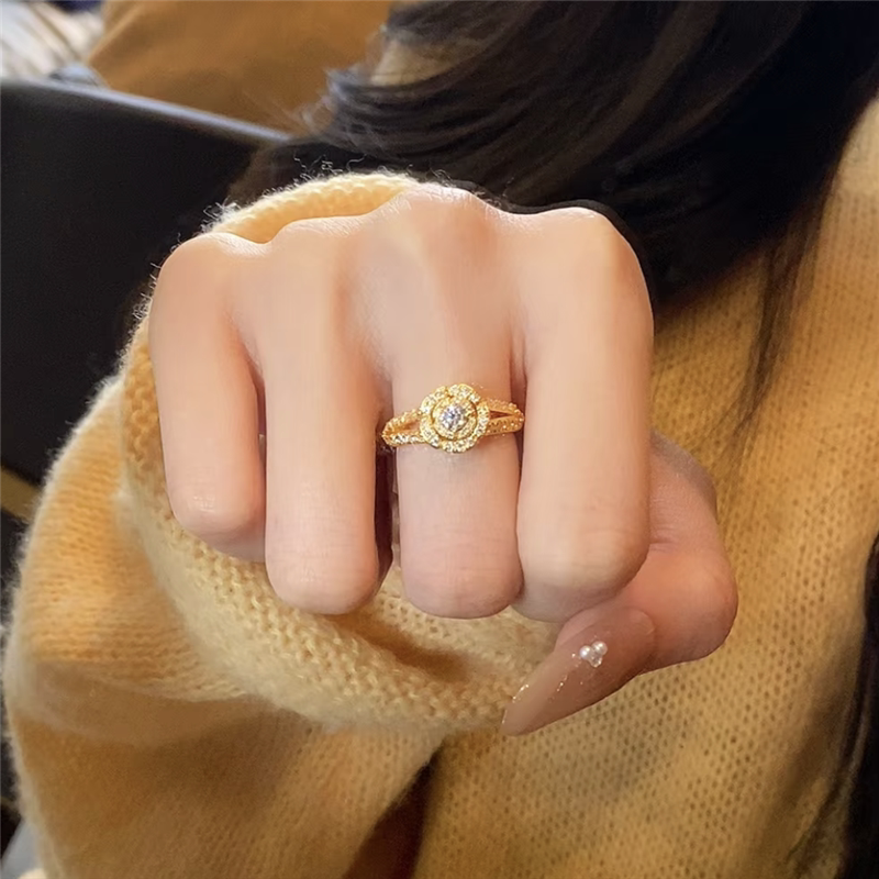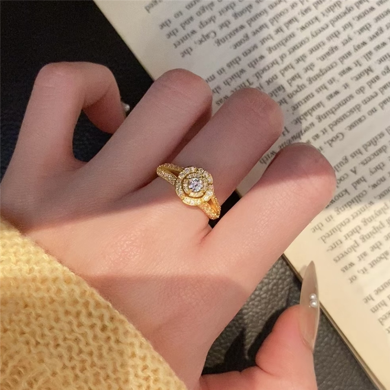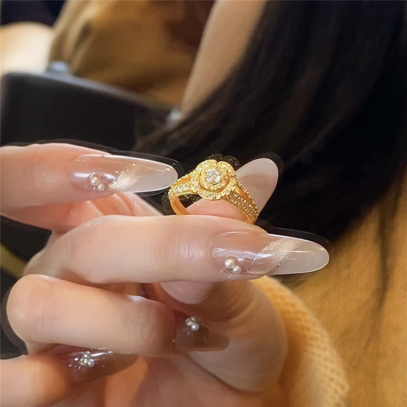 📚 999黄金色轻奢亮钻锆石花朵戒指女告白玫瑰花钻戒送女友婚戒指环