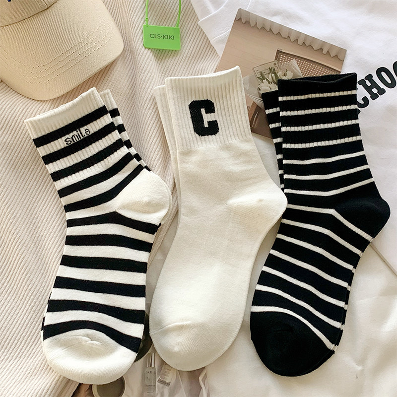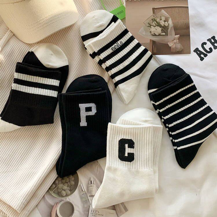 📚 字母P黑色袜子女中筒春秋棉袜ins潮韩版情侣日系百搭运动冬款长袜