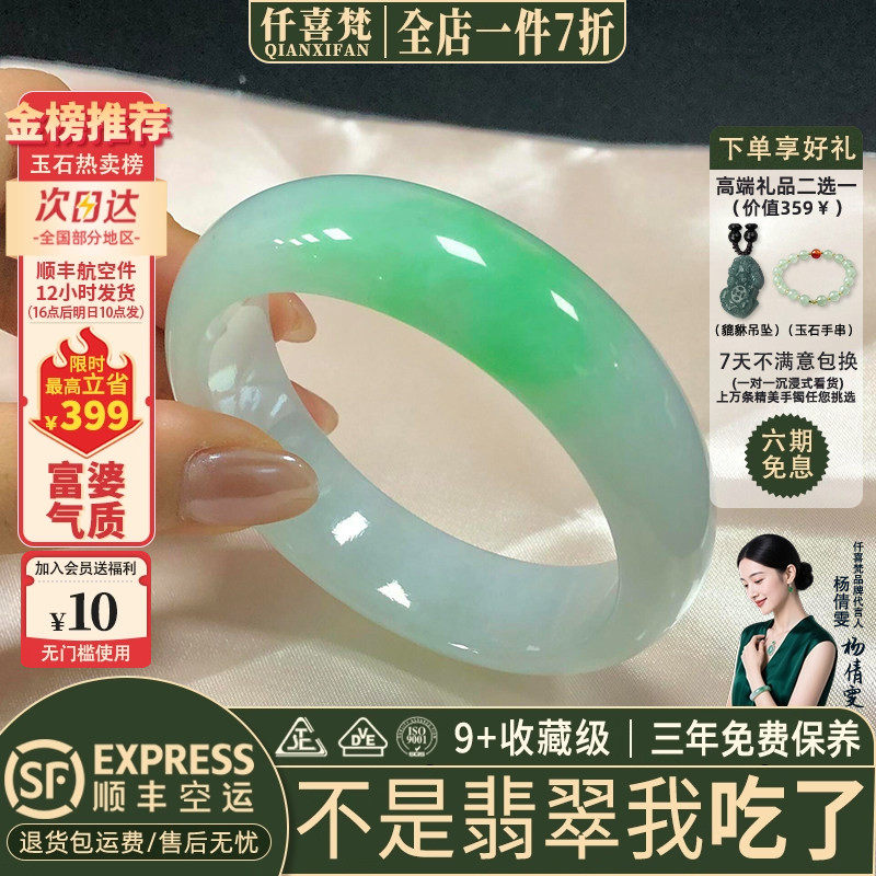 📚 仟喜梵“绿油油”高端缅甸翡翠玉手镯子女款纯色冰飘花真玉石处理