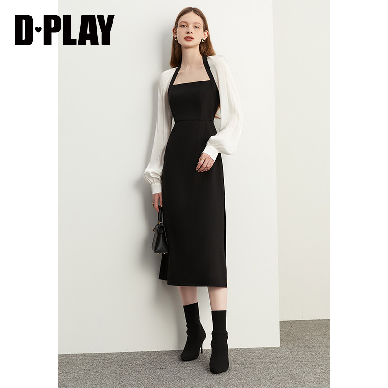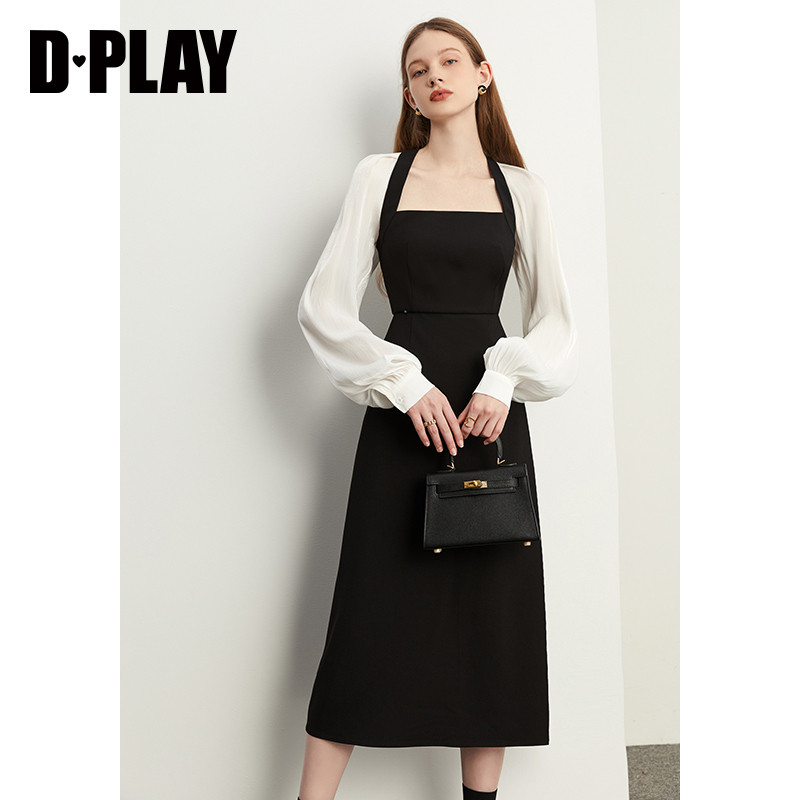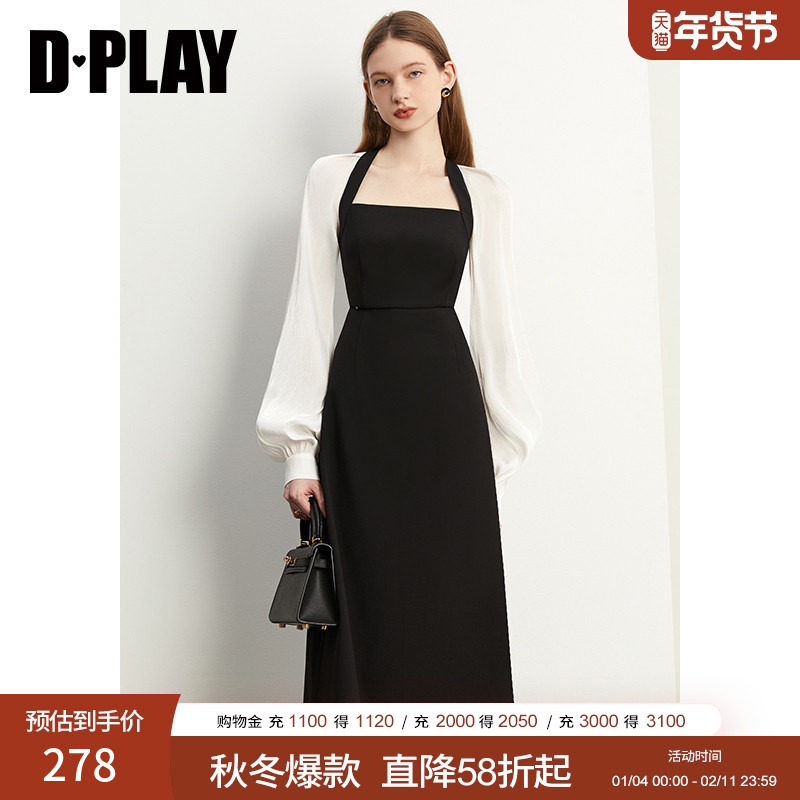 📚 DPLAY2025年秋季新款黑白长袖连衣裙女法式轻礼服裙鎏光纱长裙