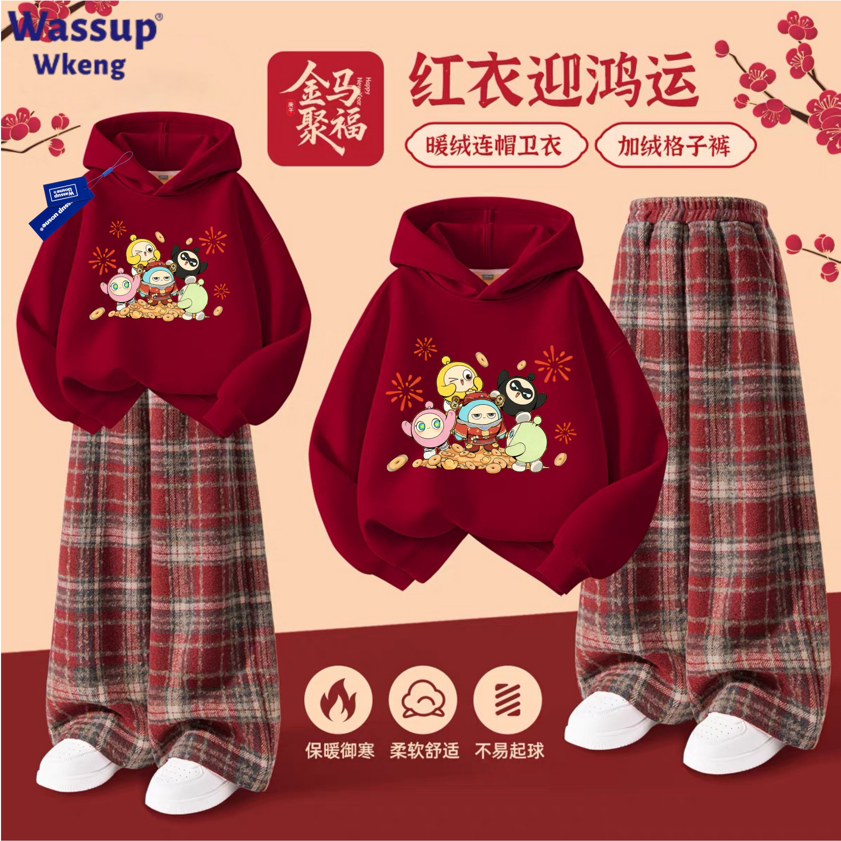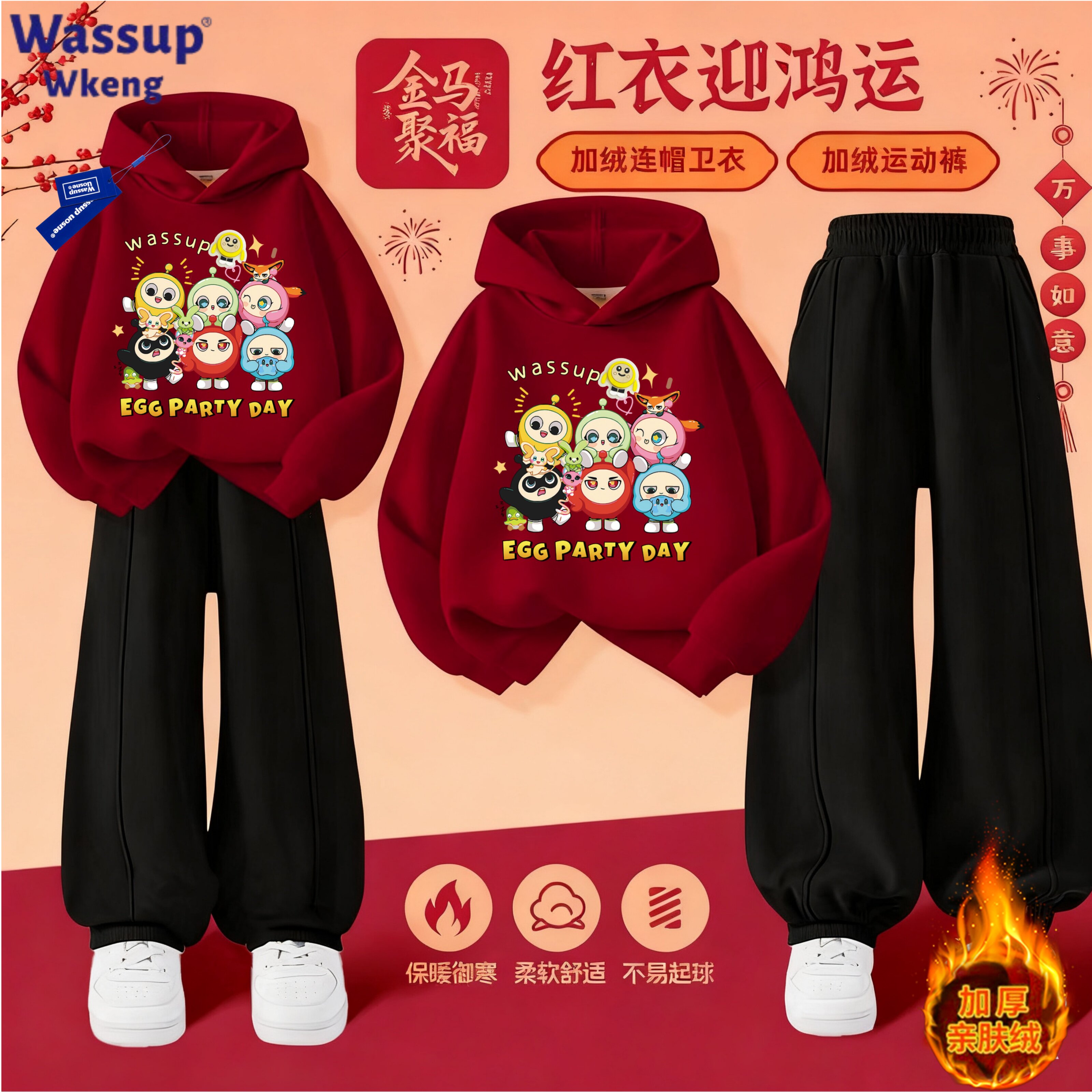 📚 WASSUP蛋仔派对亮灯儿童连帽卫衣套装加绒秋冬女童洋气喜庆两件套