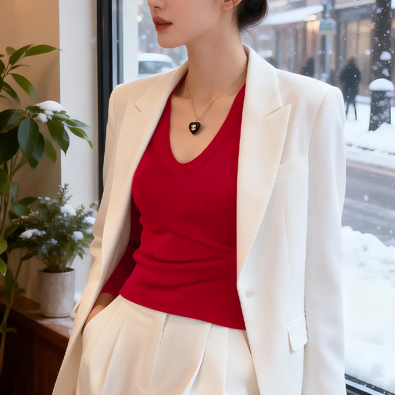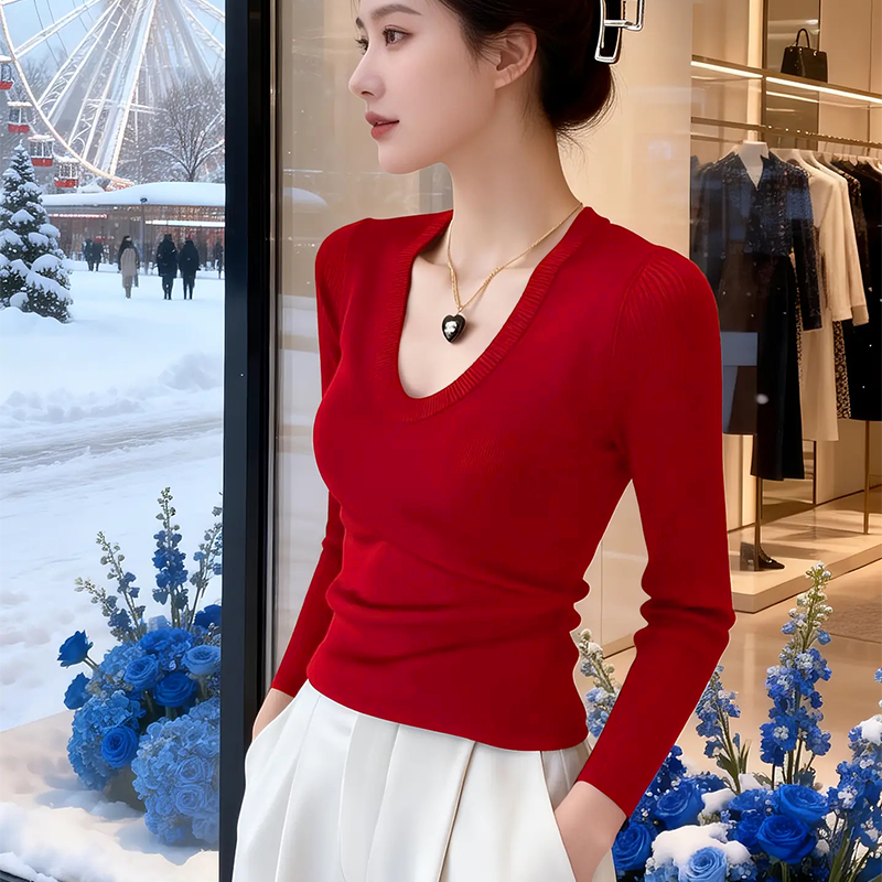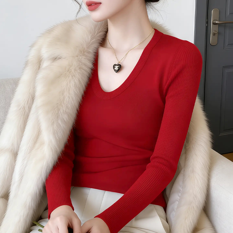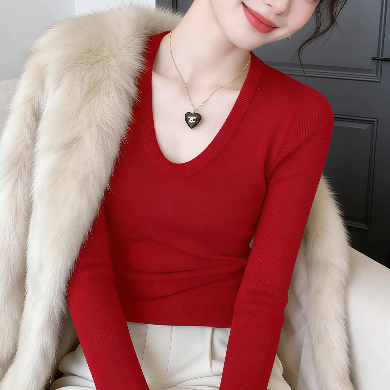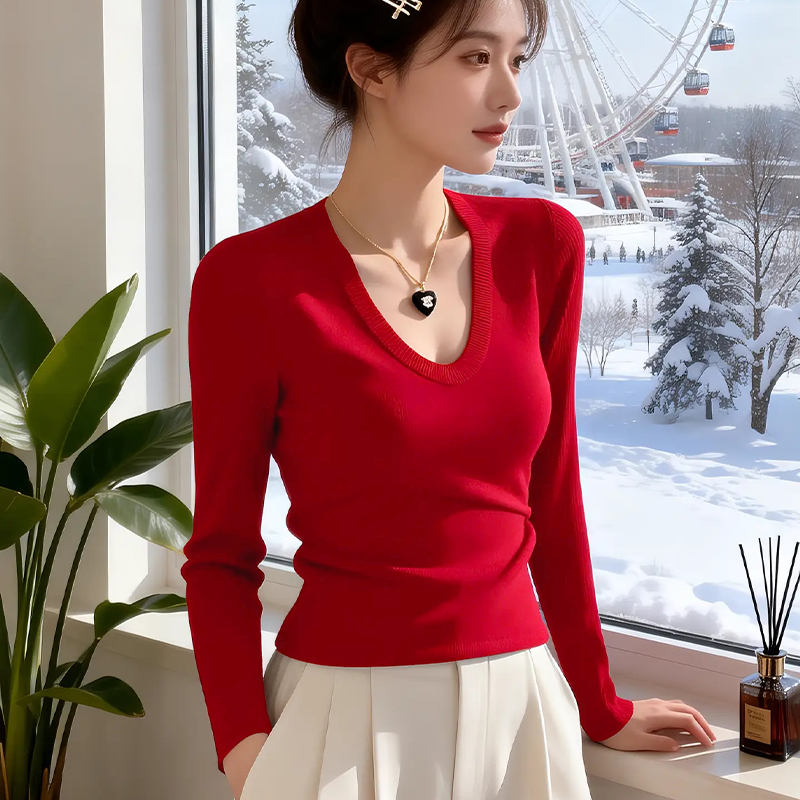 📚 春季女装外穿洋气高级感红色u领打底毛衣过年衣服内搭针织衫上衣