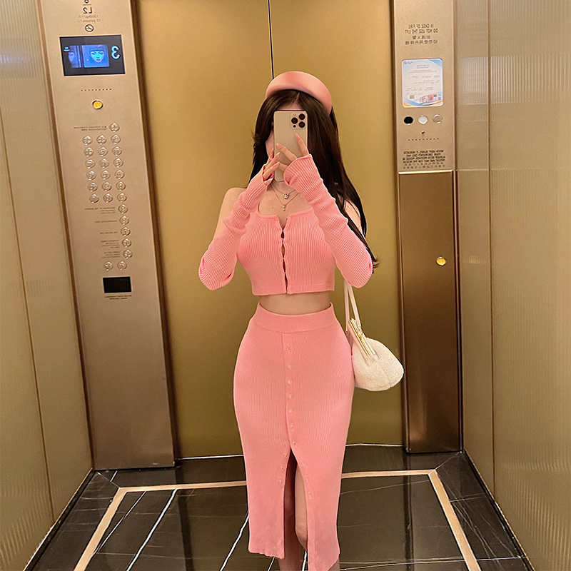 📚 【甜心Barbie】俄罗斯小众品牌芭比粉针织上衣性感开衩半裙三件套