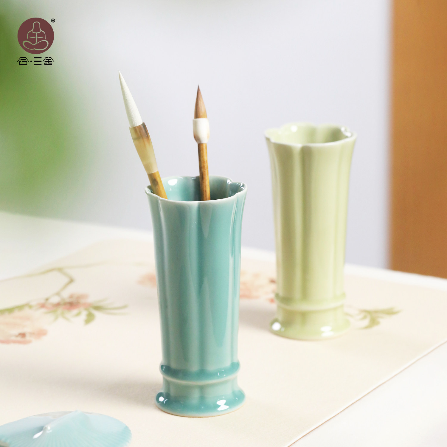📚 合三舍 陶瓷毛笔筒汝窑色瓷器青瓷笔筒文房四宝摆件毛笔收纳归置插笔筒笔缸书法花瓣毛笔收纳瓷器文房四宝