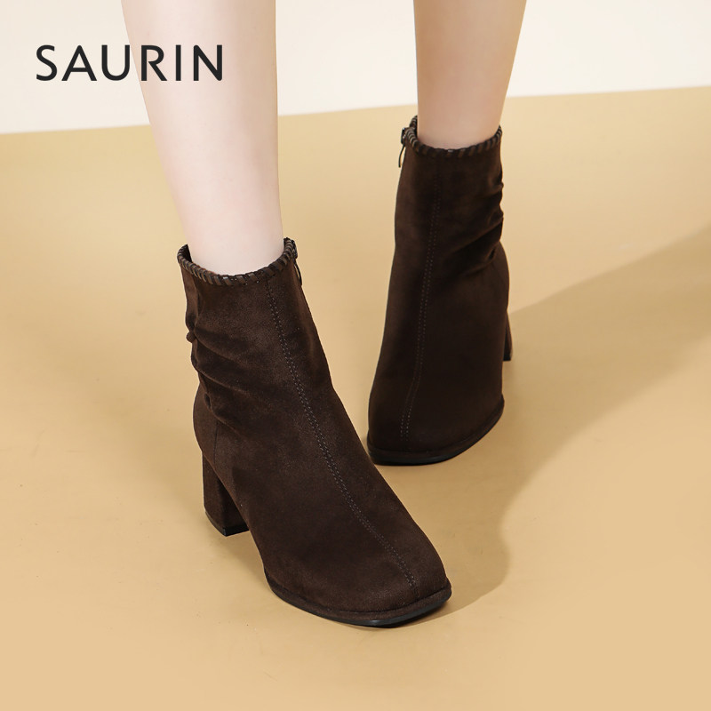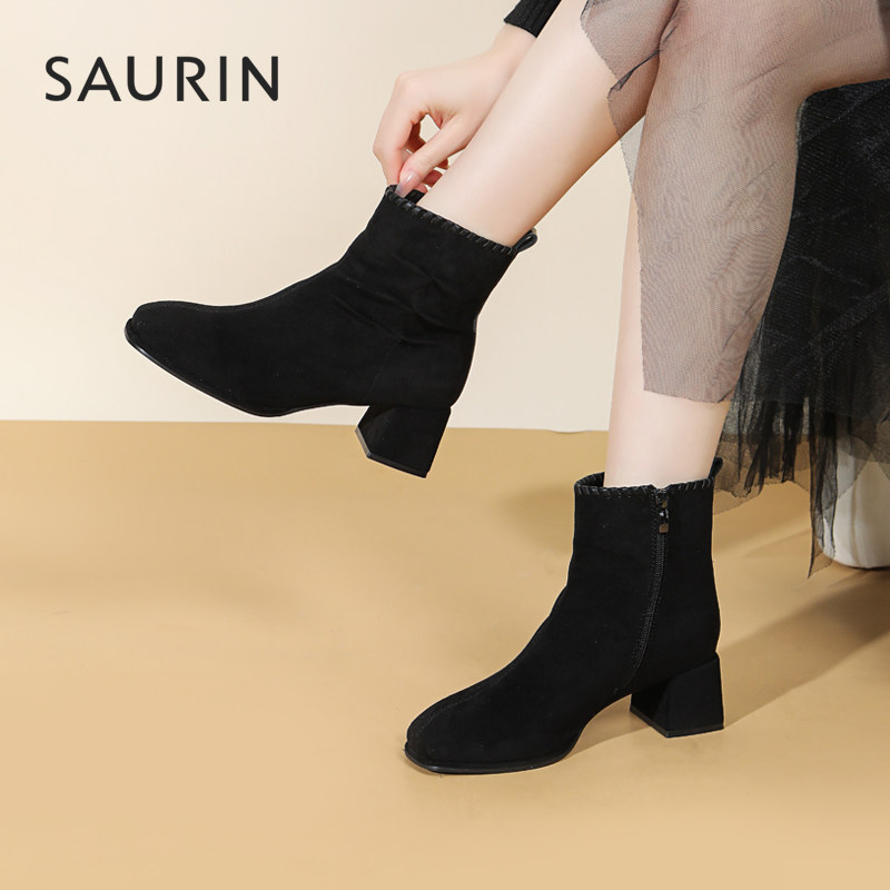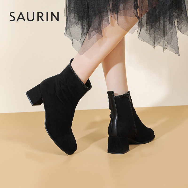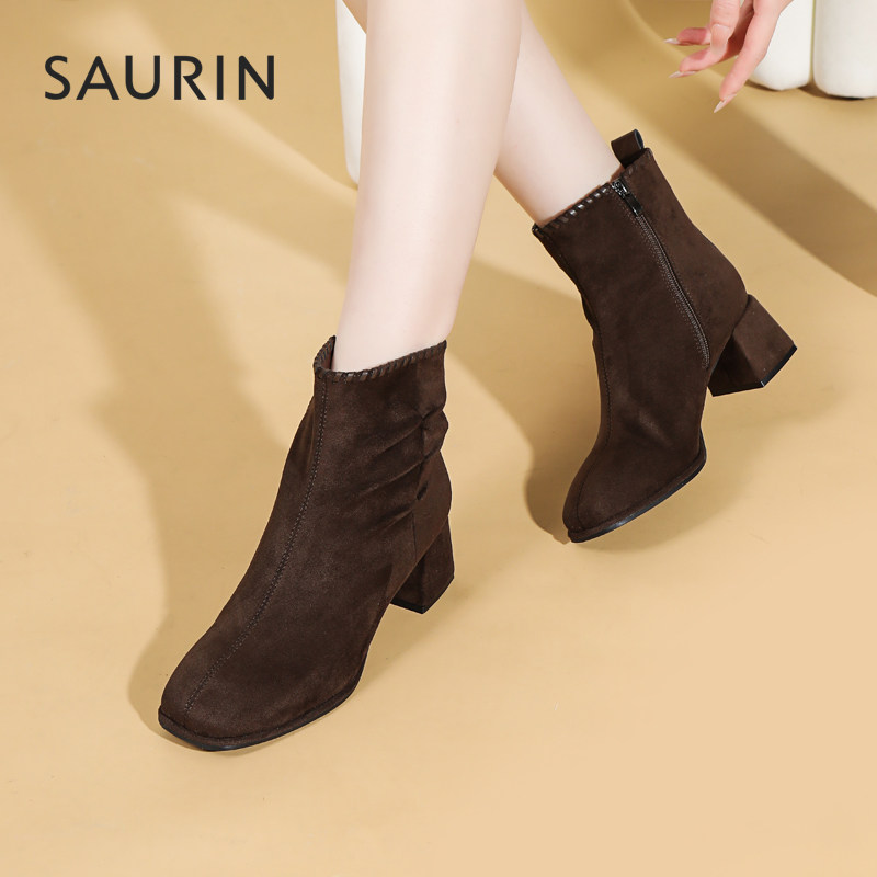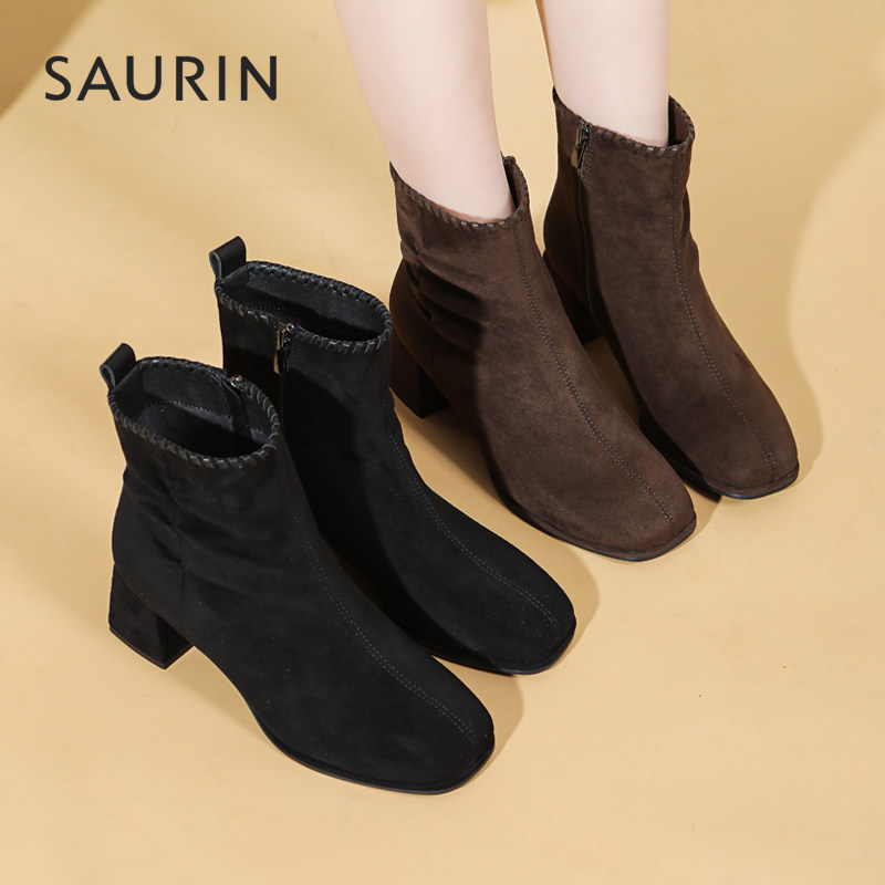 📚 索兰短靴女2025秋冬新款复古时尚瘦瘦靴方头粗跟时装靴25DT39515
