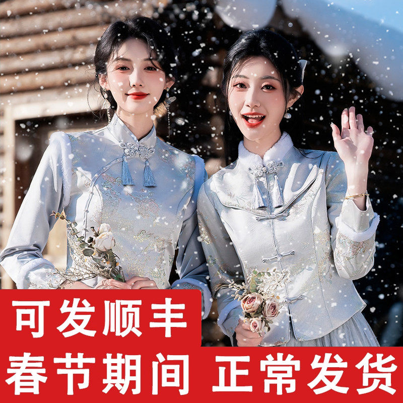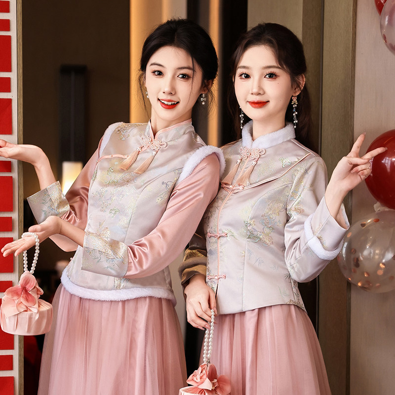 📚 新中式伴娘服冬装女2025新款姐妹团礼服长袖保暖小个子旗袍伴娘裙
