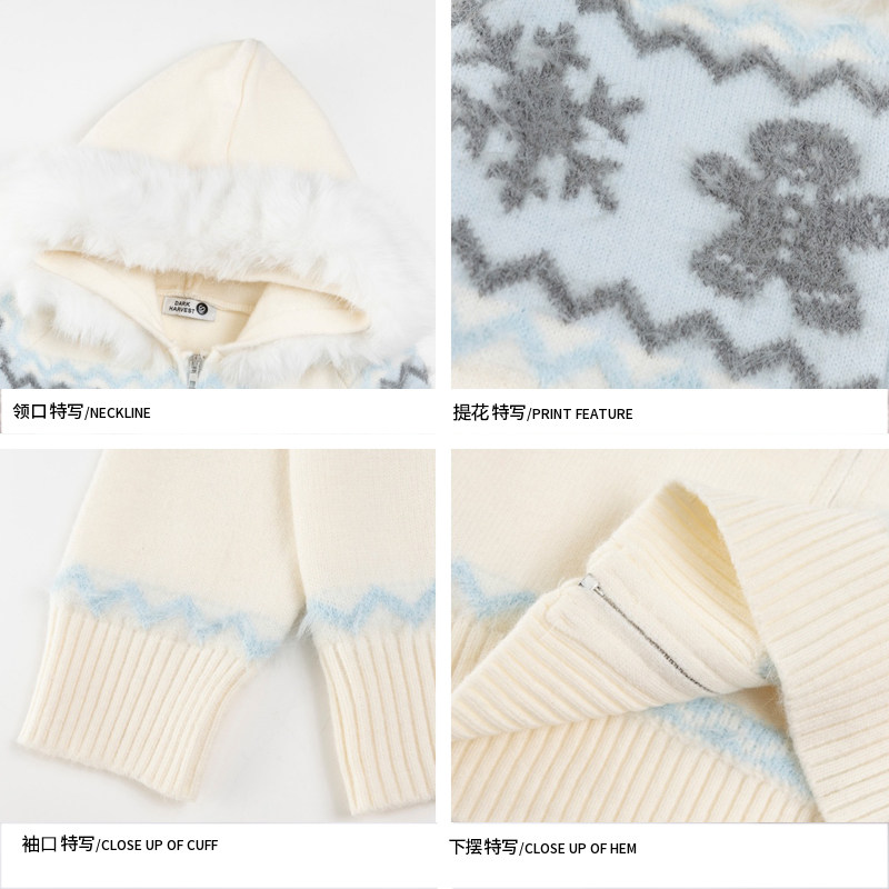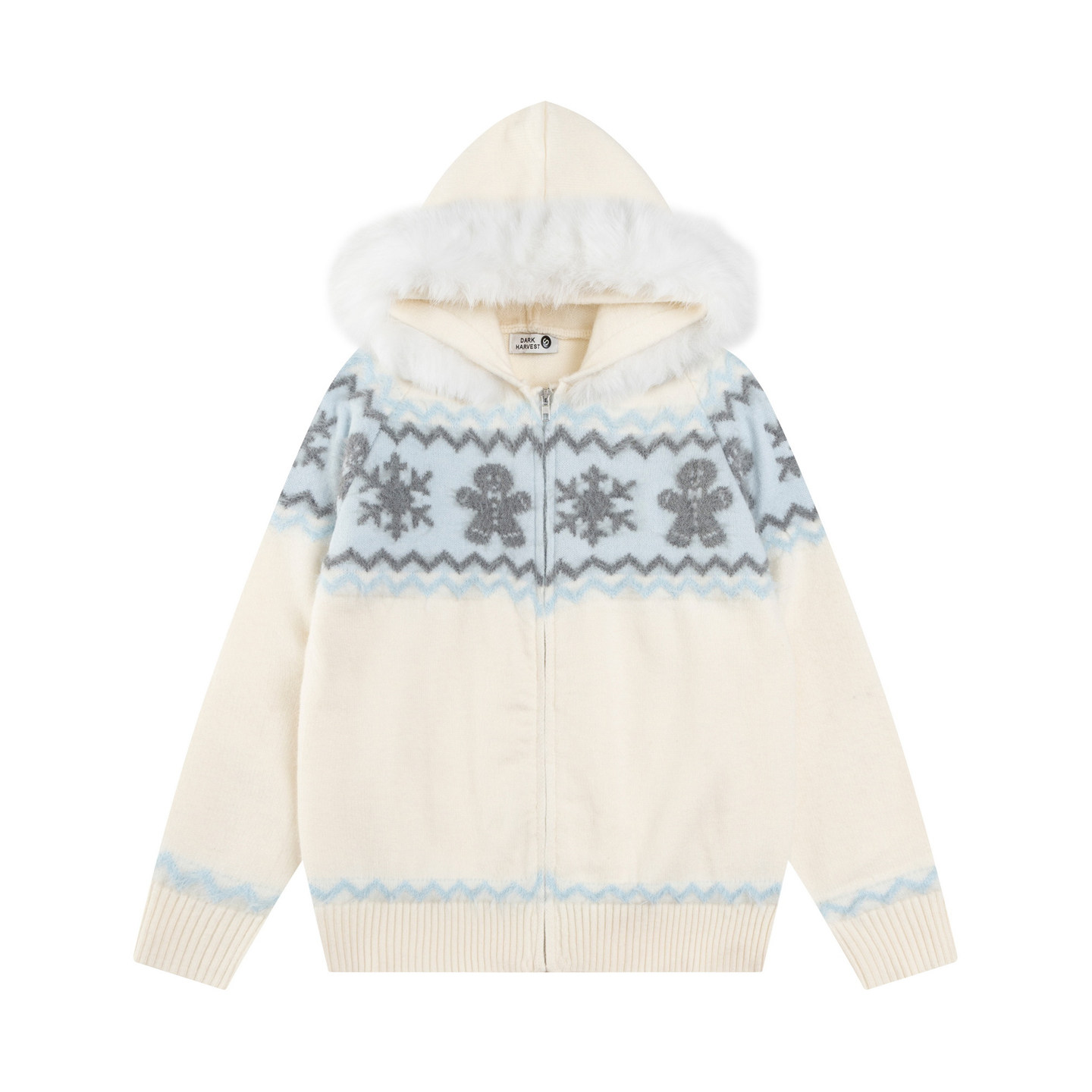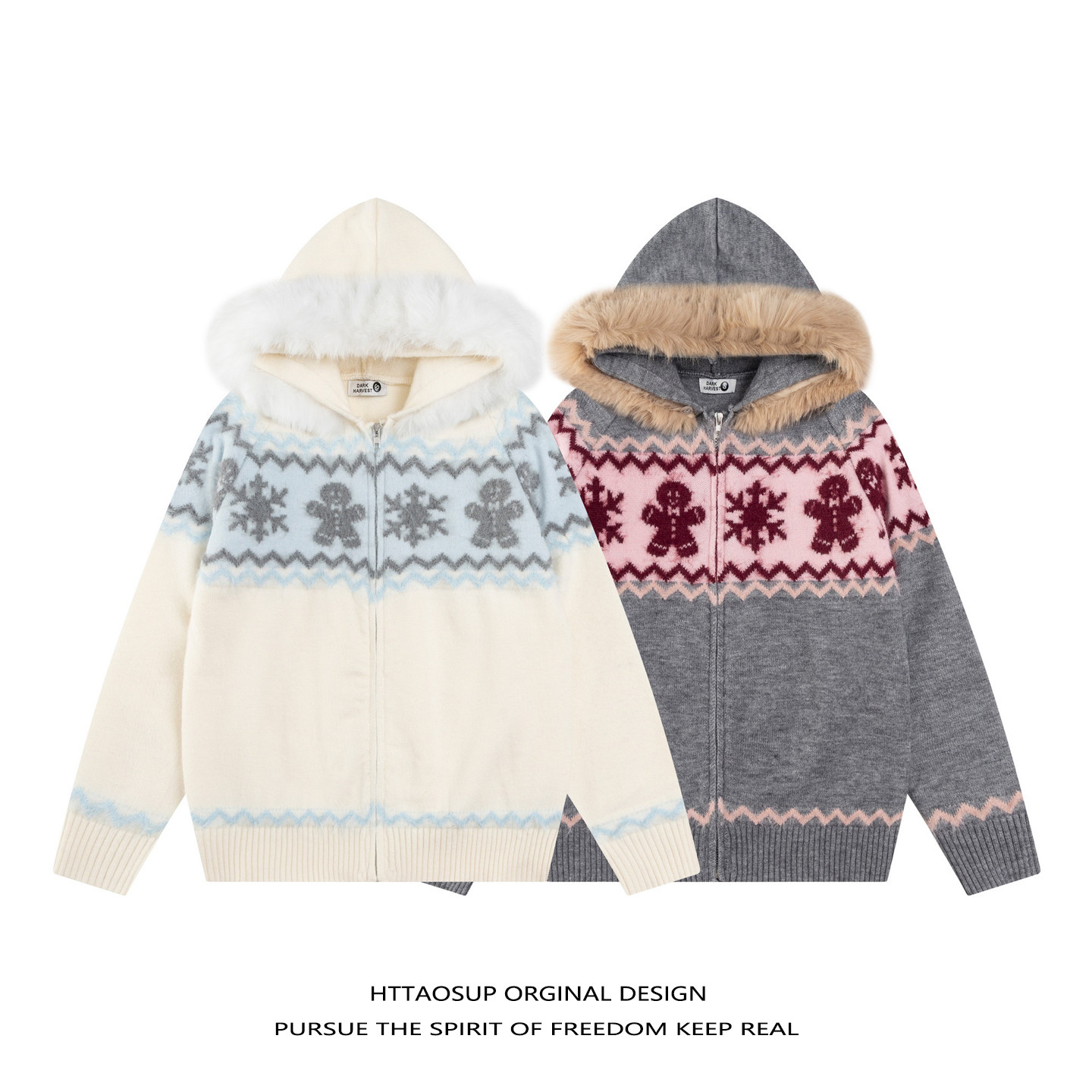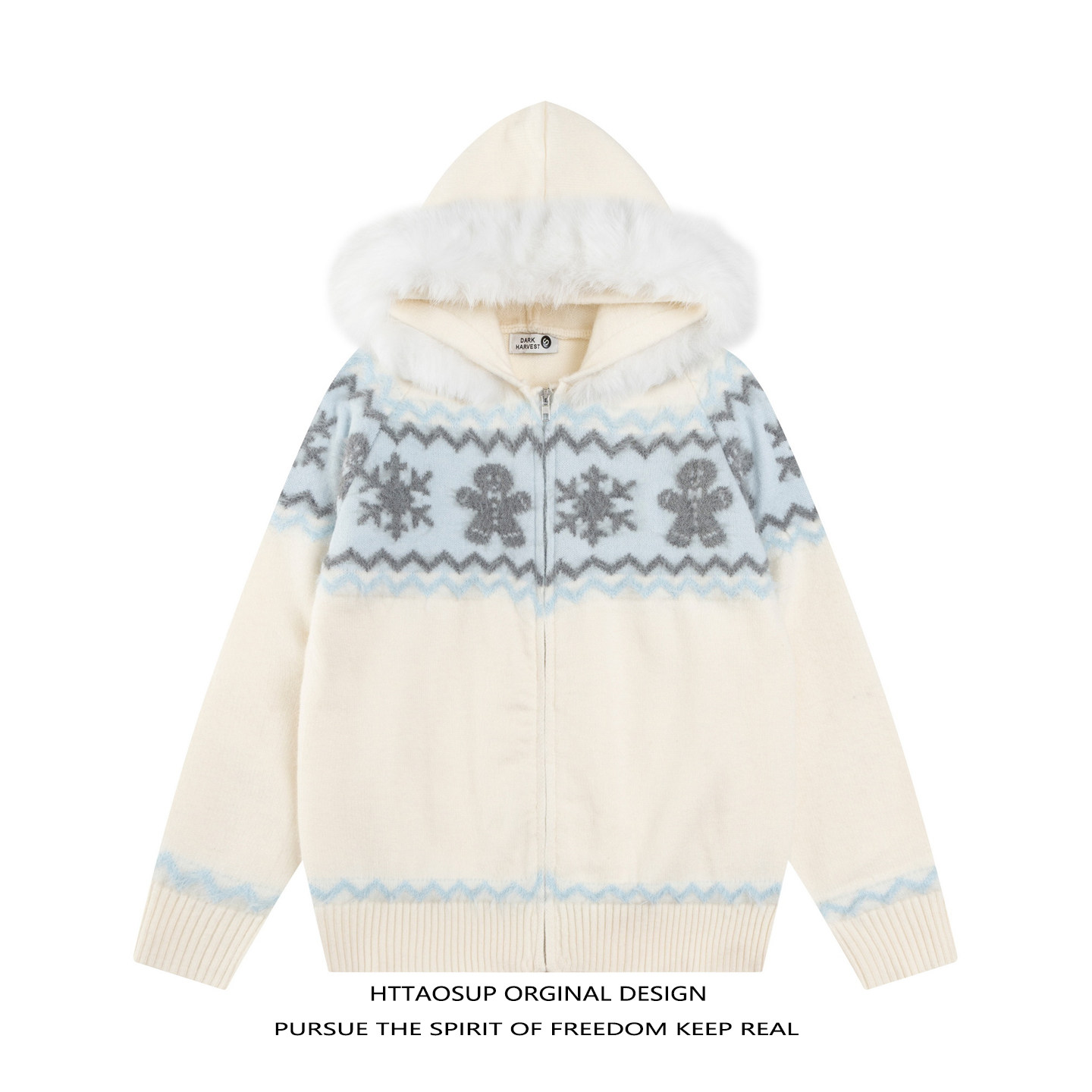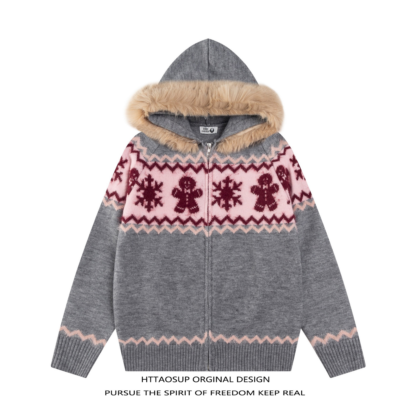 📚 HTTAOSUP美式复古费尔岛毛领连帽毛衣男女宽松学院风情侣针织外套