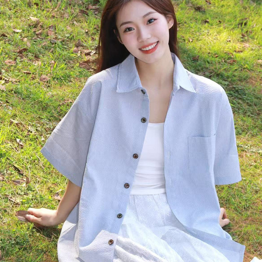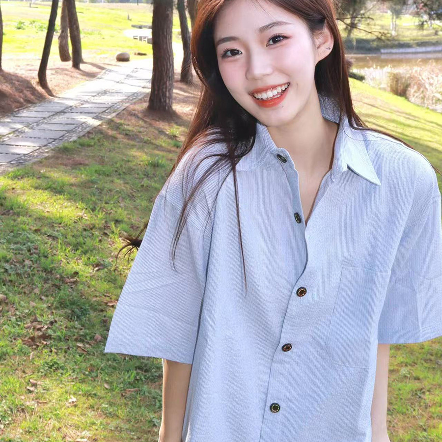 📚 日系条纹短袖衬衫女夏季2026年新款复古宽松休闲慵懒风男女款衬衣