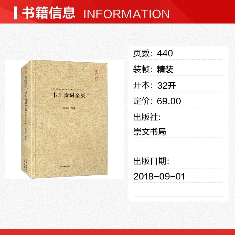 29¥ CZ321 nAB1Uj6SJFf¥ https://m.tb.cn/h.7sJE2Ln 韦庄诗词全集[汇校汇注汇评] 谢永芳 中国古诗词文学 新华书店正版图书籍 崇文书局 --------------------- 【原售价】32.9元 【现售价】32.9元。