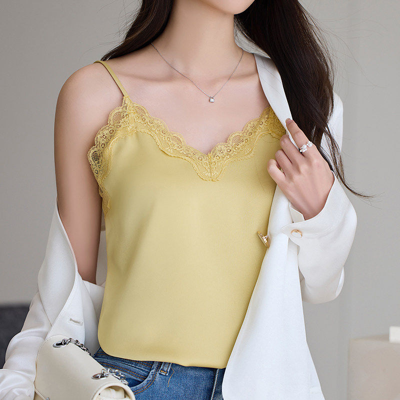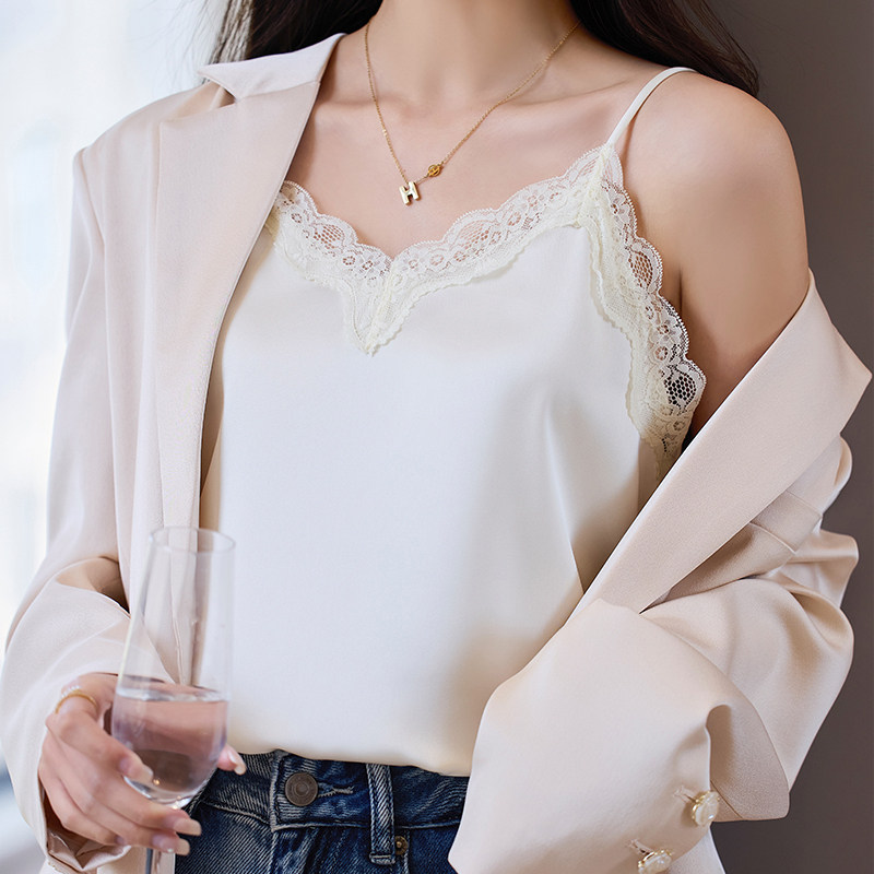 📚 蕾丝吊带内搭背心女白色新款V领仿真丝上衣醋酸缎面小西装打底衫