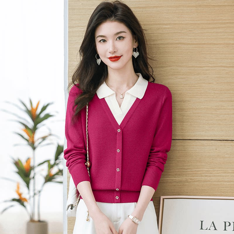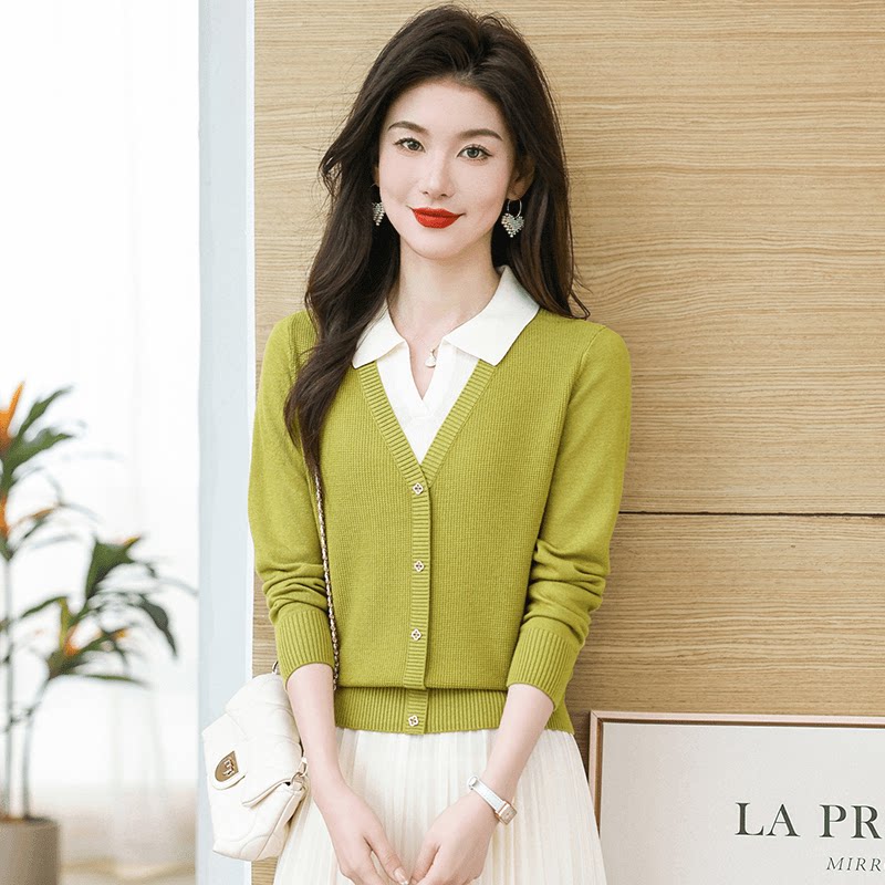 📚 2025春季新款小方领长袖翻领假两件洋气百搭小衫显瘦宽松长袖针织